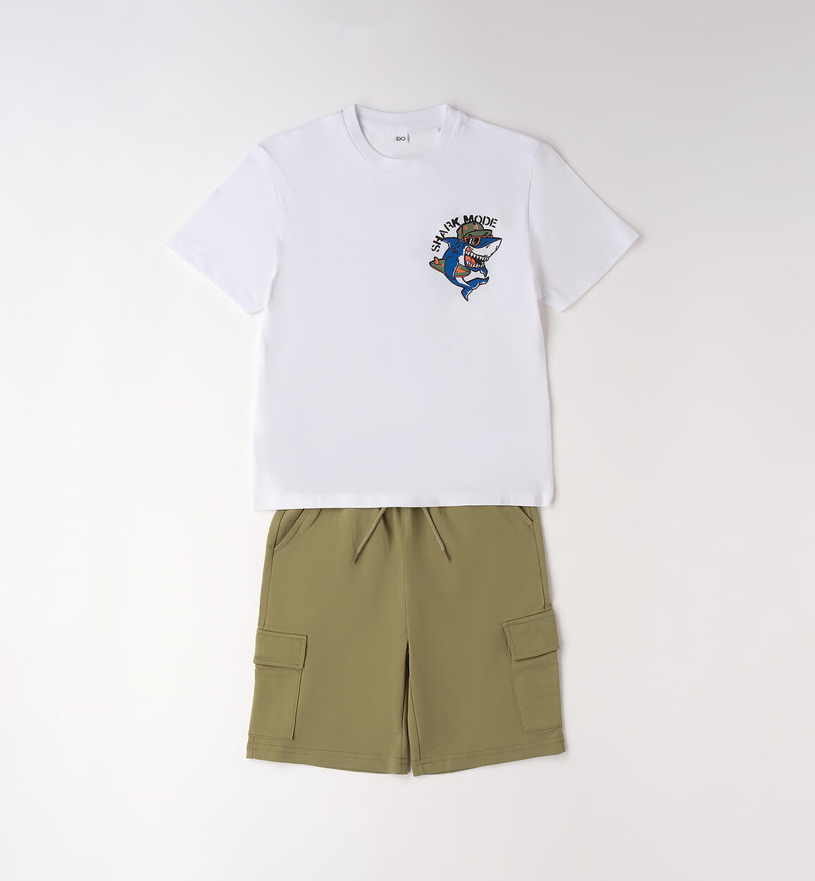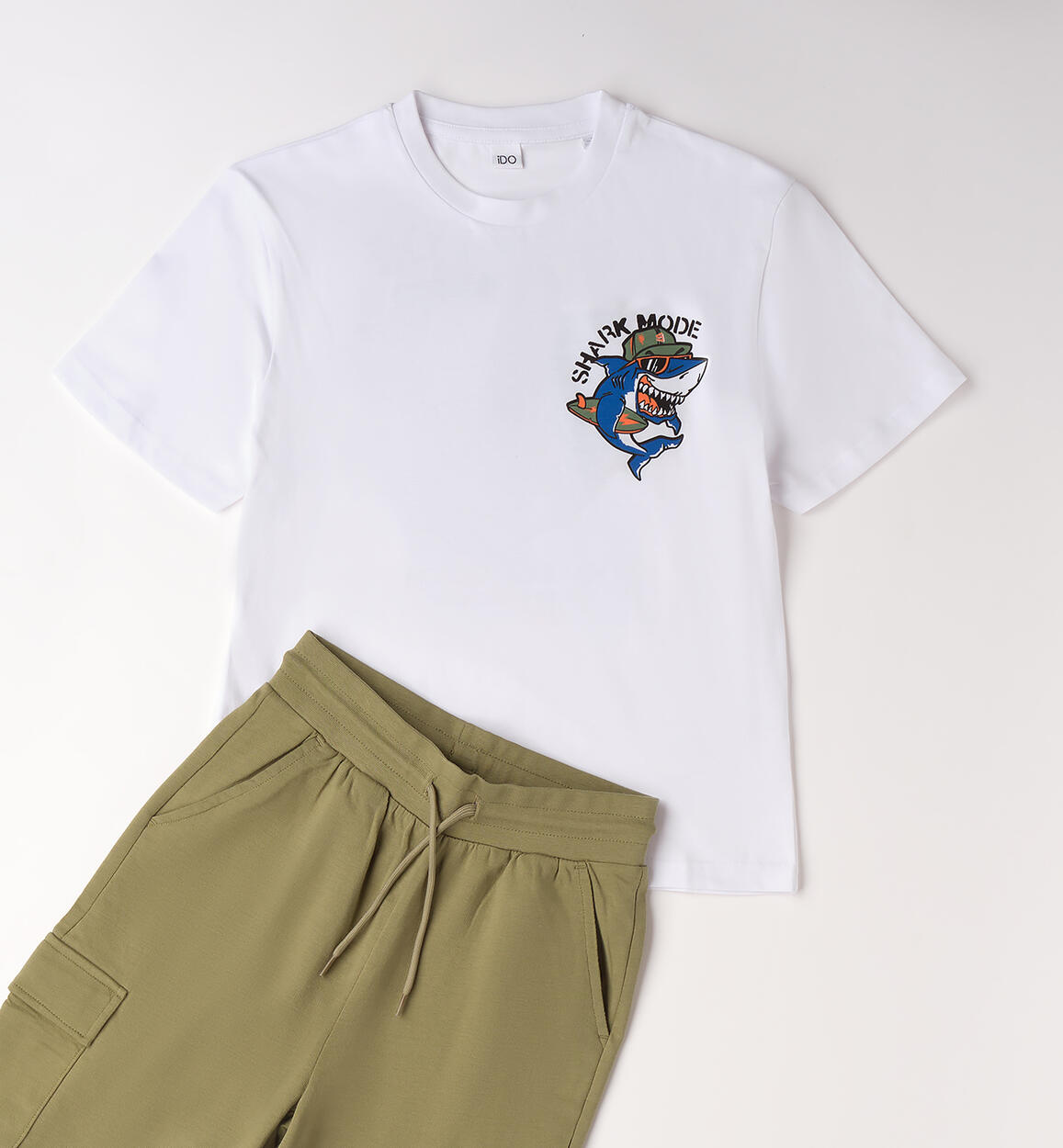 iDO boys' summer outfit made from 100% cotton. Oversized jersey T-shirt with shark print. Sweatshirt shorts, basketball style with large side pockets. Elasticated waistband and drawstring. Oversized fit.