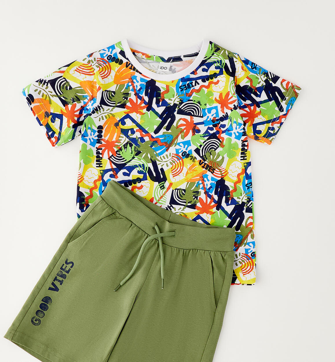 iDO boys' summer set in 100% cotton jersey. T-shirt with colorful all-over print. Shorts with elastic waistband and drawstring. Knee length. By choosing our cotton products, you support iDO's commitment to the Better Cotton mission. This product is supplied through a mass balance system and may not contain Better Cotton. Read more at bettercotton.org/massbalance
