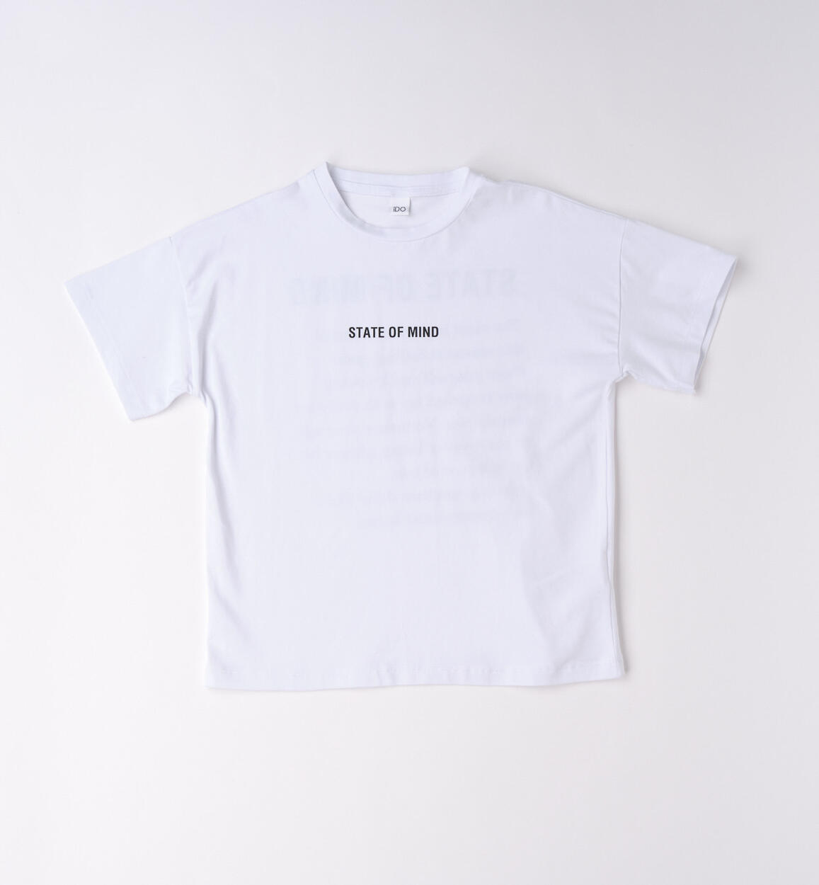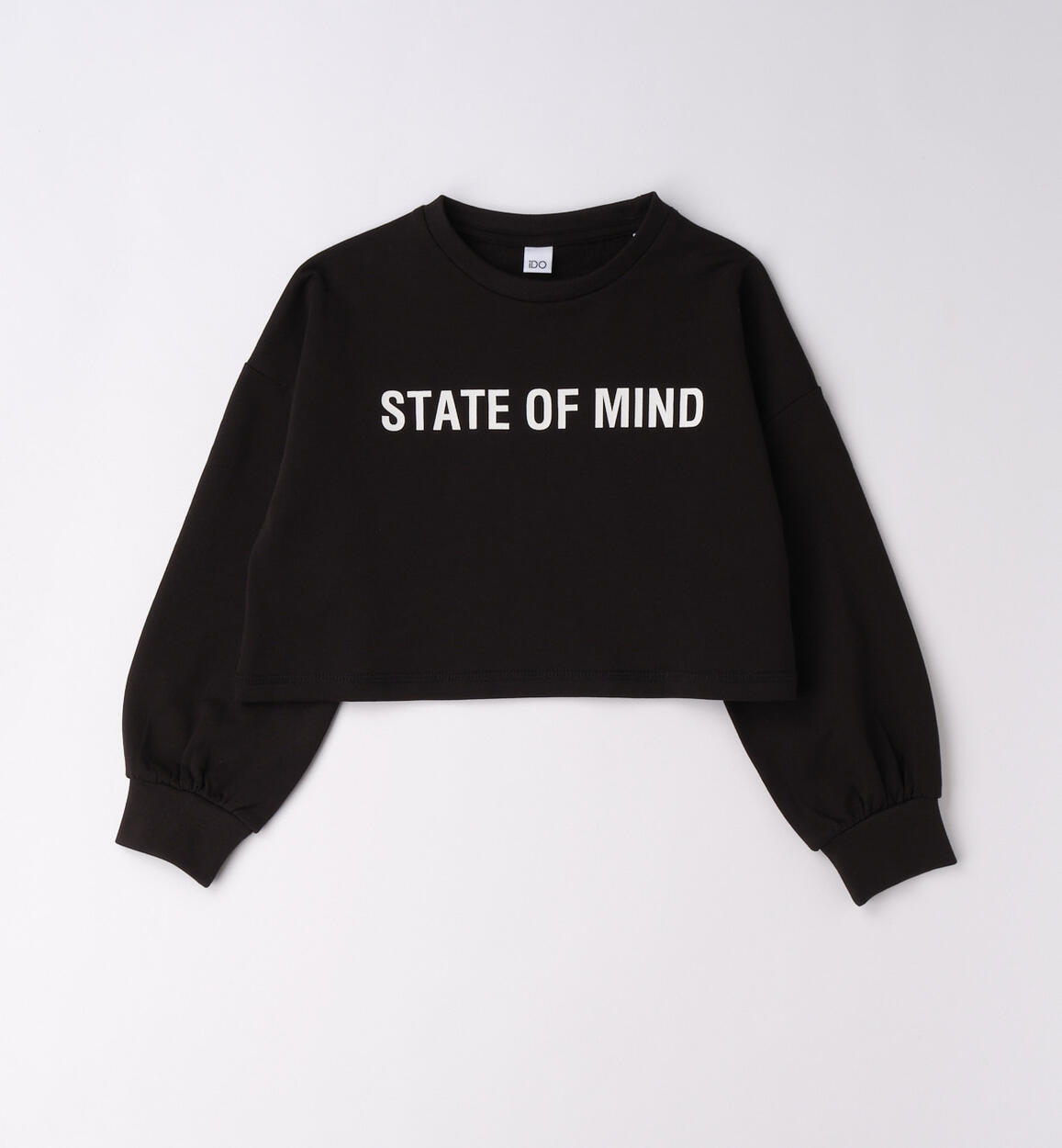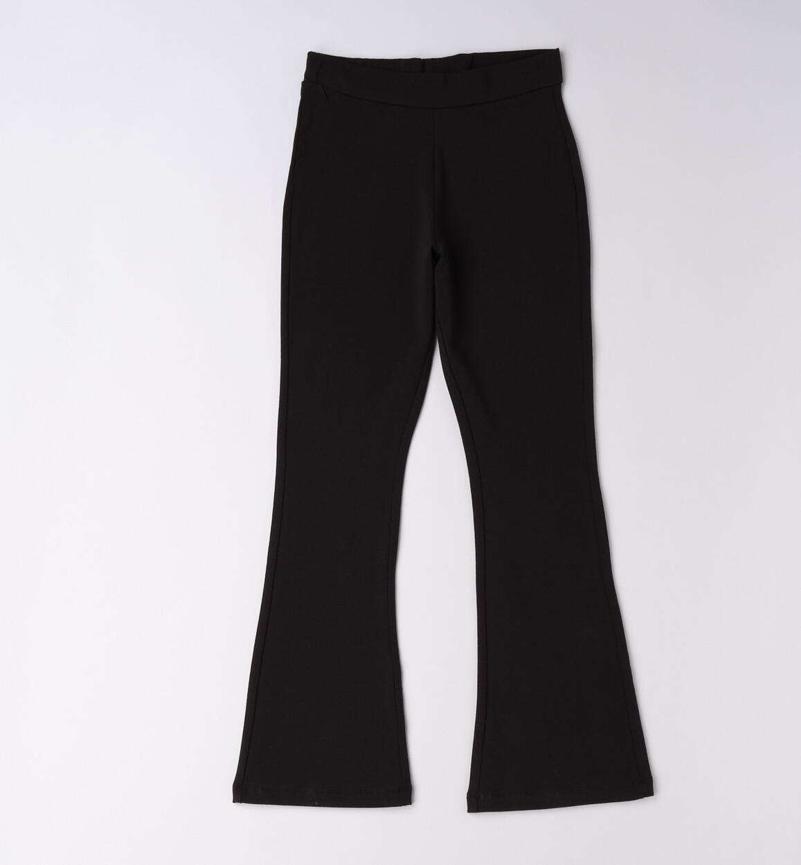 Three-piece set for girls by iDO made from cotton. French terry sweatshirt with print on the front. Stretch cotton jersey T-shirt. Long flared pants in stretch cotton jersey.