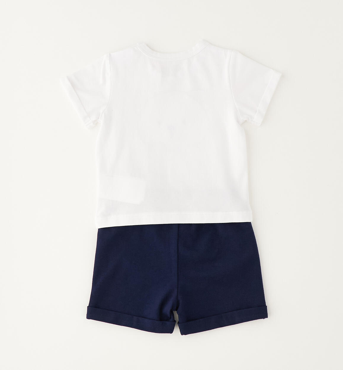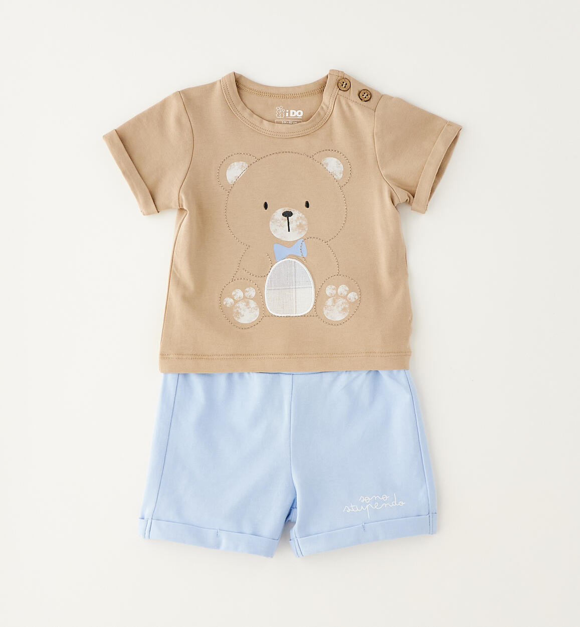 iDO summer outfit for boys aged 1 to 24 months, made from stretch cotton jersey. The T-shirt has button fastening at the shoulder and is embellished with embroidery and print on the front. Turn-ups at the cuffs. The shorts have an elasticated drawstring waist, printed lettering and turn-ups at the hem. By choosing our cotton products, you support our investment in the Better Cotton mission. This product is supplied through a mass balance system and may not contain Better Cotton. Read more at bettercotton.org/massbalance