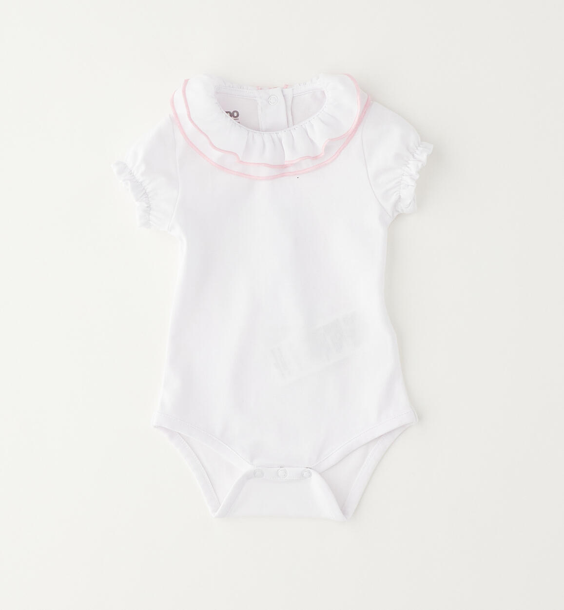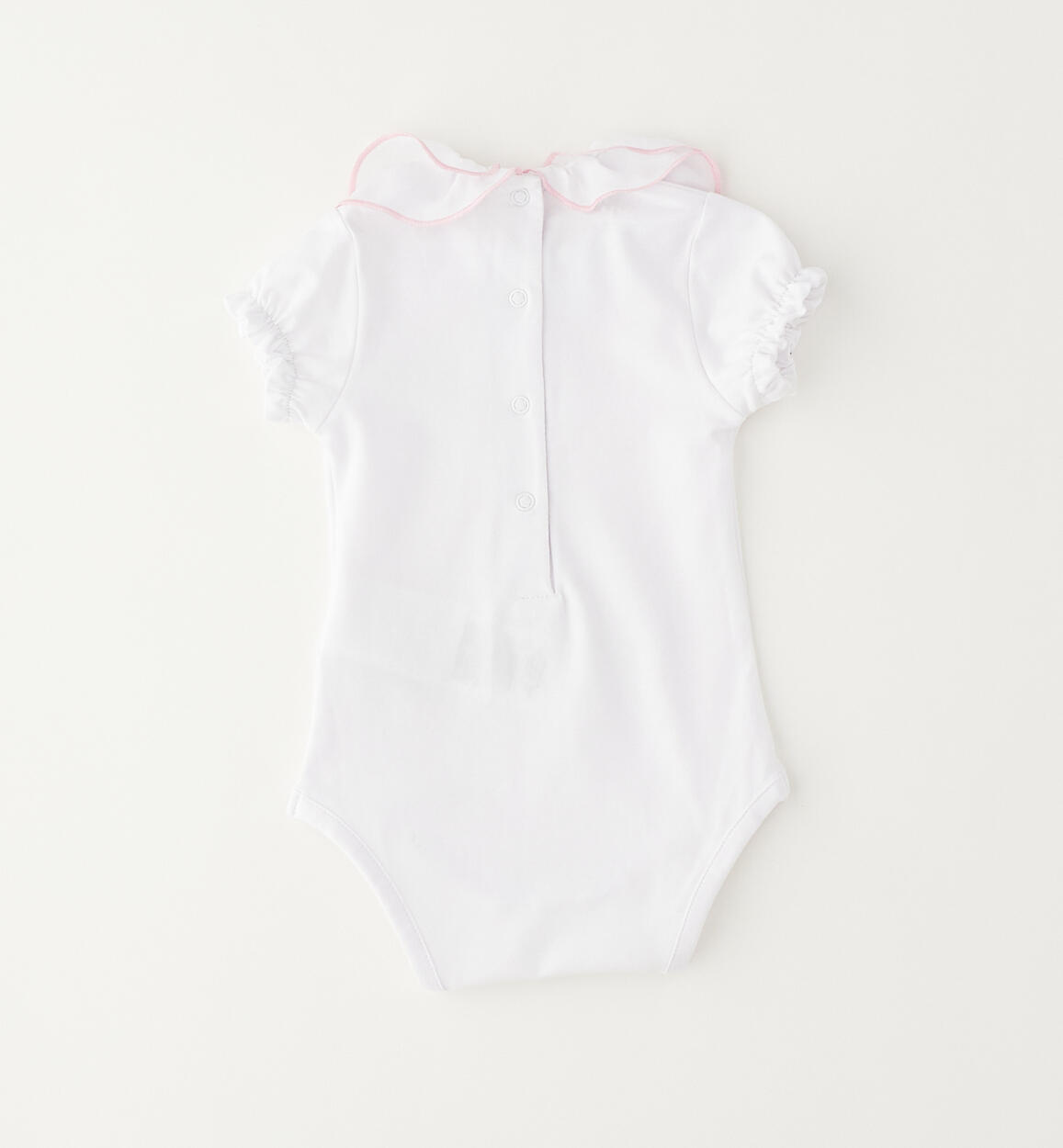 iDO short-sleeved bodysuit for girls aged 1 to 24 months, made from stretch cotton jersey. Opening at the back and under the legs with press studs. Model with collar and elasticated cuffs. By choosing our cotton products, you support our investment in the Better Cotton mission. This product is supplied through a mass balance system and may not contain Better Cotton. Read more at bettercotton.org/massbalance
