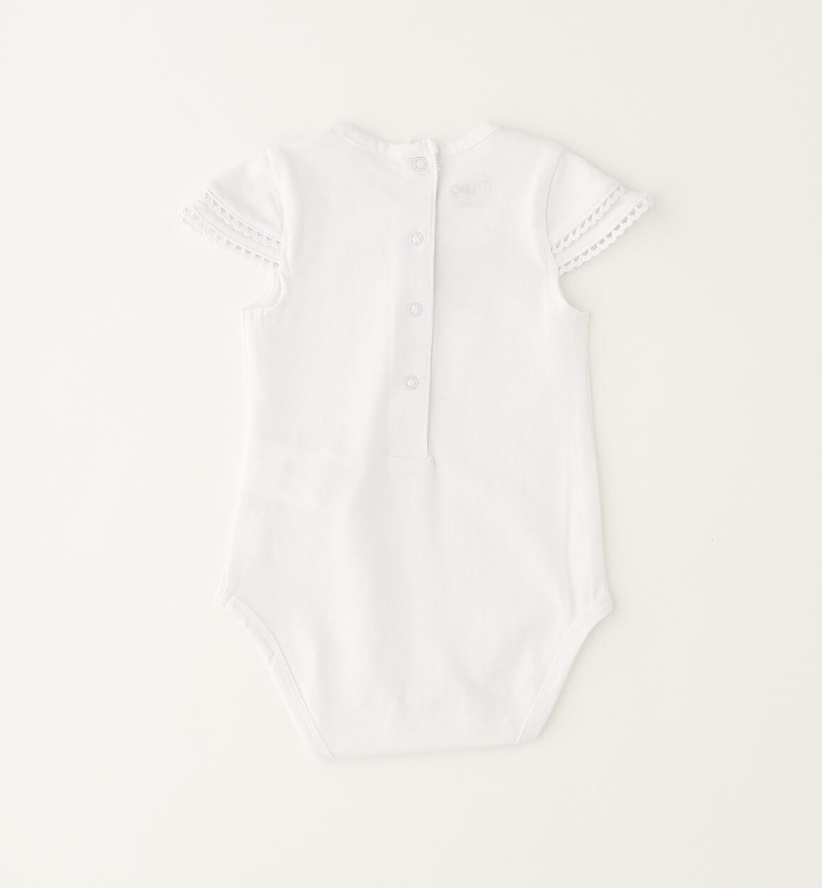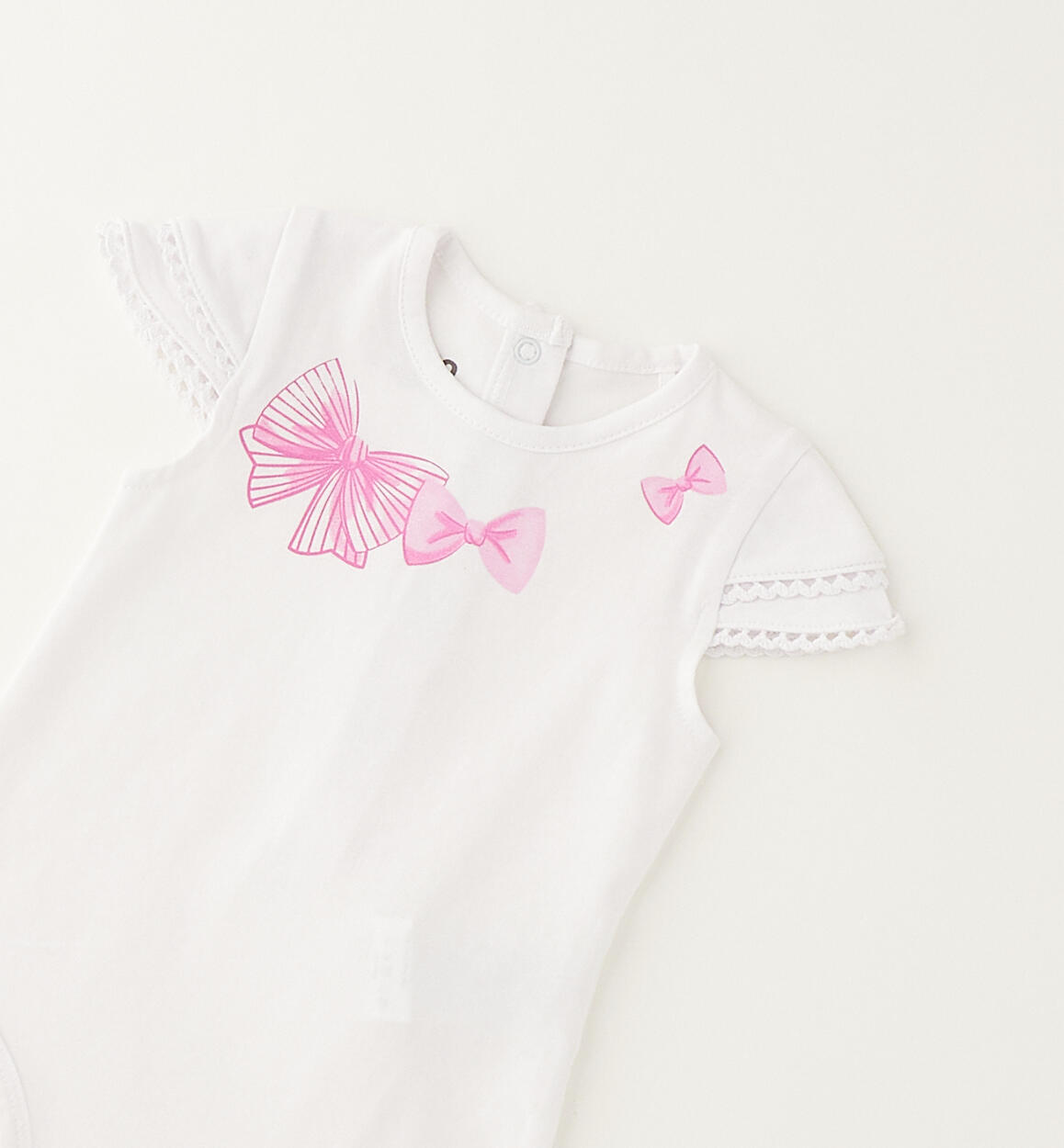 iDO short-sleeved bodysuit for girls aged 1 to 24 months, made from stretch cotton jersey. Bow print and macramé lace trim on the cuffs. The design features press studs at the back and under the legs for easy changing and dressing. By choosing our cotton products, you are supporting our investment in the Better Cotton mission. This product is supplied through a mass balance system and may not contain Better Cotton. Read more at bettercotton.org/massbalance