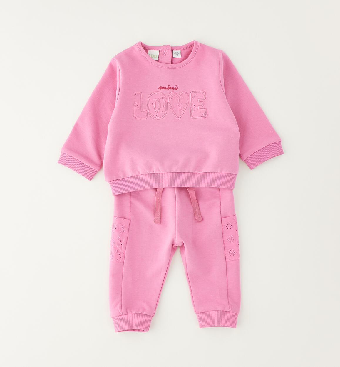 iDO jumpsuit for girls aged 1 to 24 months, made from stretch cotton French terry with broderie anglaise details. The sweatshirt has a press stud fastening at the back. The front is embellished with embroidery and appliqué details. Trousers with an elasticated waistband and drawstring. By choosing our cotton products, you are supporting our investment in the Better Cotton Initiative. This product is supplied through a mass balance system and may not contain Better Cotton. Read more at bettercotton.org/massbalance