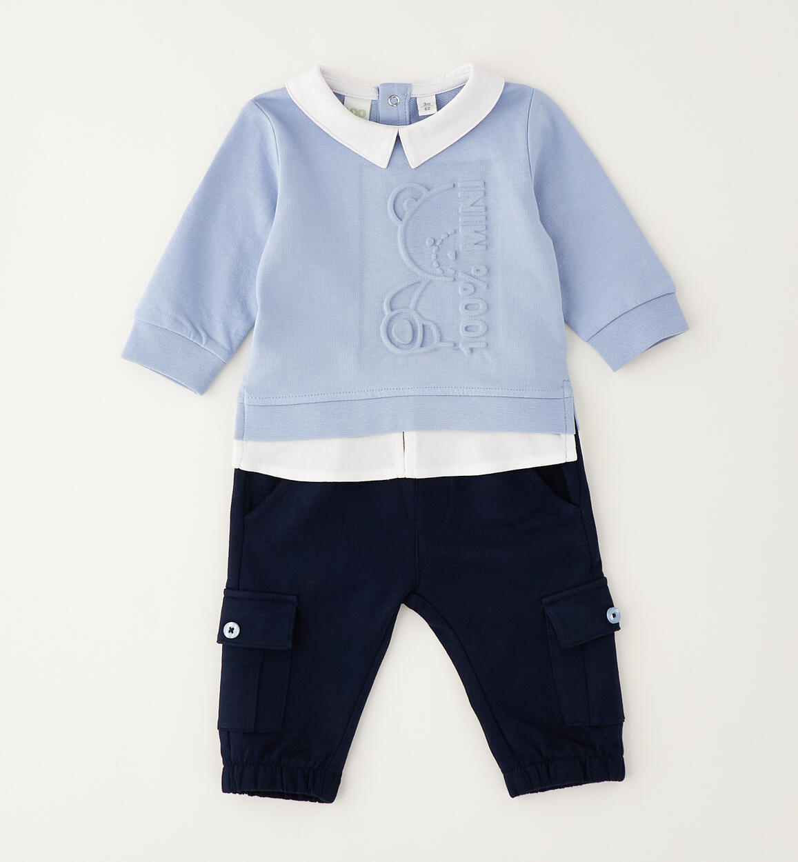 iDO outfit for children aged 1 to 24 months, made from 100% cotton fleece. The fleece is French terry with an embossed print, press stud fastening at the back and jersey inserts for a double-layer effect. Trousers with pockets and large side pockets. Elasticated waist and cuffs at the bottom of the legs. By choosing our cotton products, you support our investment in the Better Cotton mission. This product is supplied through a mass balance system and may not contain Better Cotton. Read more at bettercotton.org/massbalance