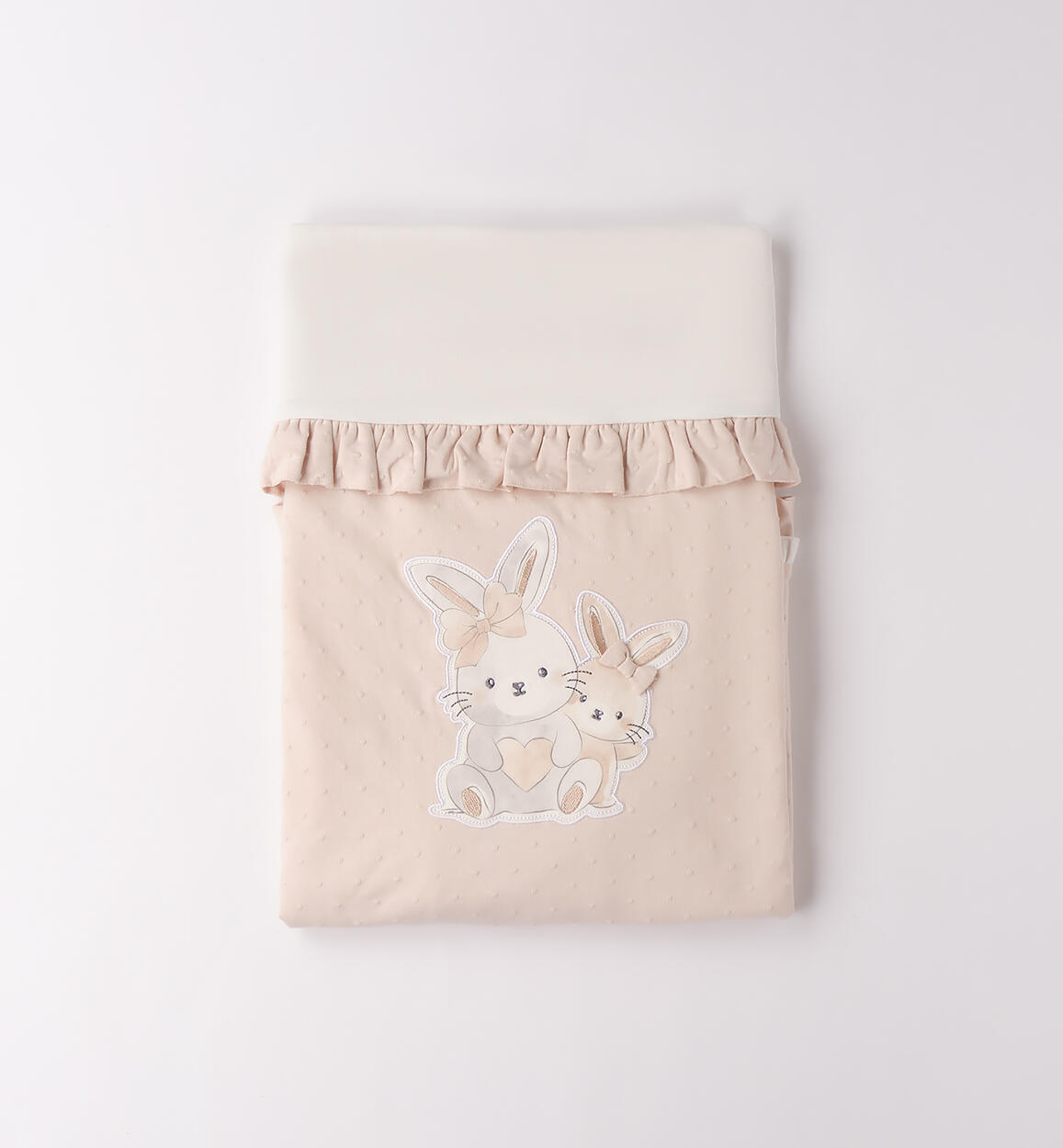 iDO baby blanket made from stretch cotton jersey with polka dot pattern and embroidered bunny print appliqué. Lightweight wadding padding. Crib size: length 100 cm and width 75 cm. The blanket comes packaged in a handy box. By choosing our cotton products, you support iDO's commitment to the Better Cotton mission. This product is supplied through a mass balance system and may not contain Better Cotton. Read more at bettercotton.org/massbalance