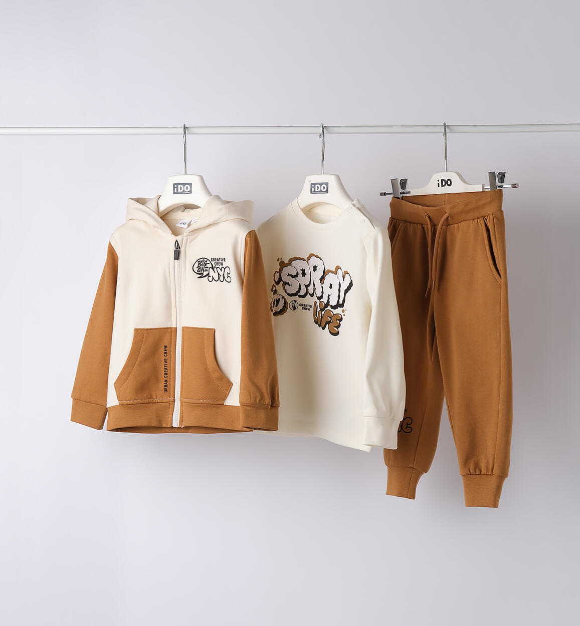 iDO boy¿s set for ages 9 months ¿ 8 years composed of winter fleece tracksuit and t-shirt. Hooded zip-up sweatshirt with print. Pants with pockets, elasticated waist with drawstring. T-shirt in interlock with large print. Better Cotton supported.