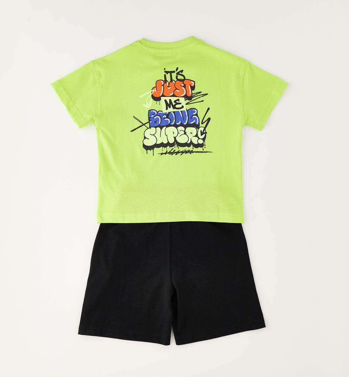 iDO summer outfit for children made from 100% cotton jersey. Oversized fit. T-shirt with print on the front and back, dropped shoulder design. Shorts, basketball style, with elasticated waistband and drawstring. By choosing our cotton products, you are supporting iDO's commitment to the Better Cotton mission. This product is supplied through a mass balance system and may not contain Better Cotton. Read more at bettercotton.org/massbalance