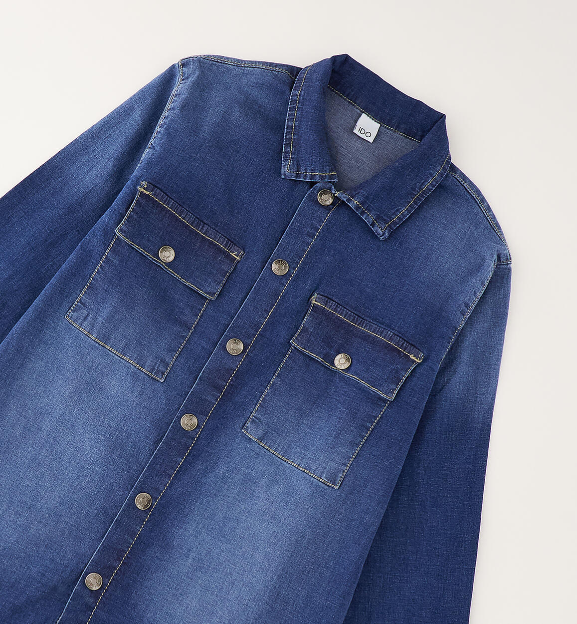 iDO long-sleeved shirt for boys made from stretch cotton denim with front pockets and press stud fastening. Oversized fit.
