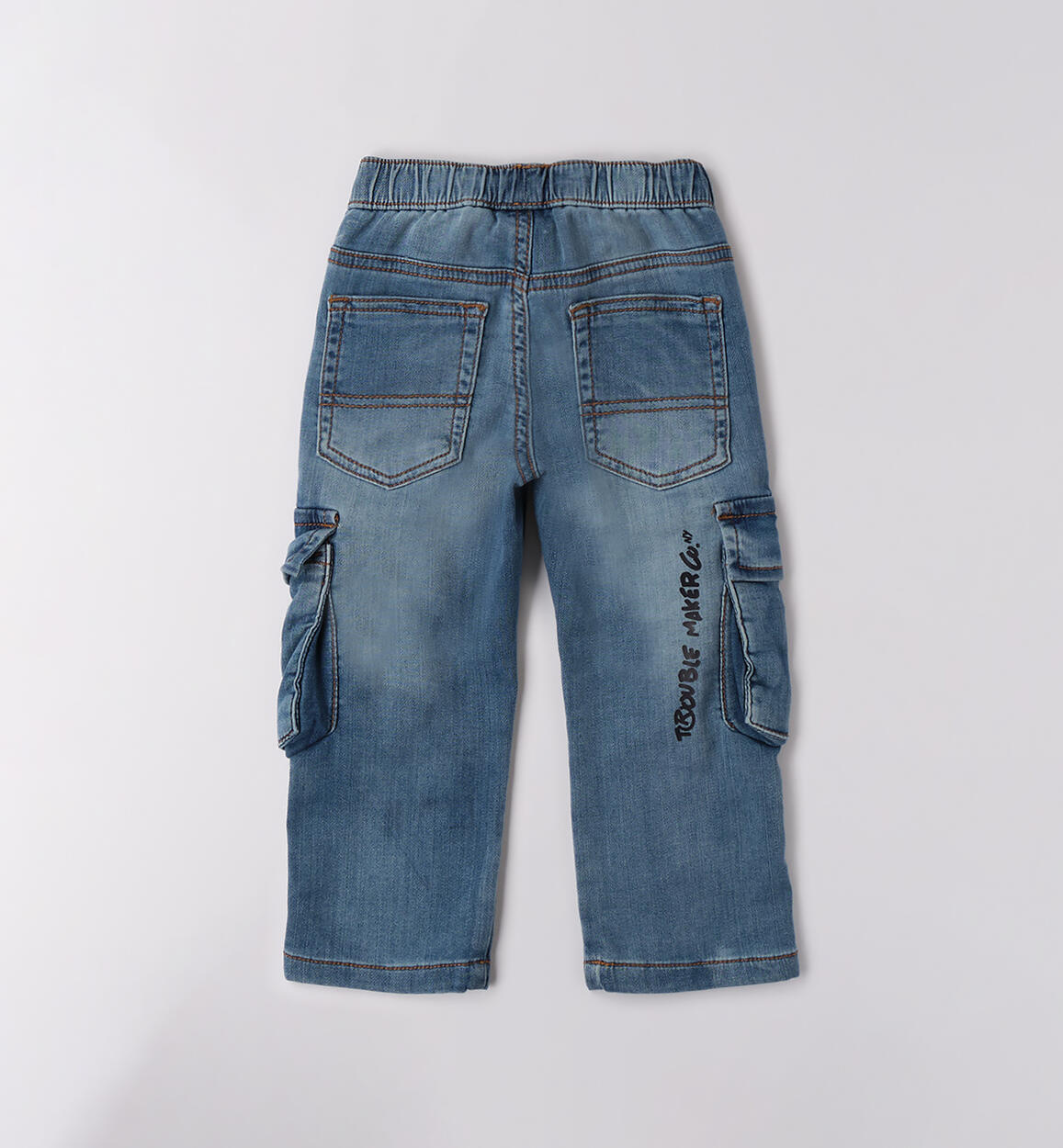 iDO boy¿s jeans for ages 9 months ¿ 8 years made from stretch cotton knit denim. Elastic waistband with drawstring. Printed details and large side pockets. Adjustable waistband with internal buttonhole elastic. Straight fit. Better Cotton supported.