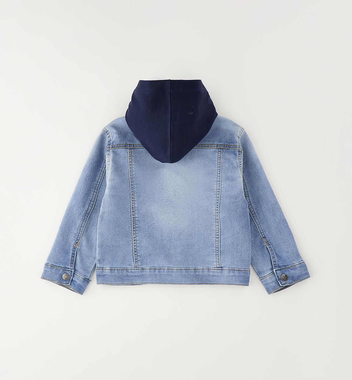 iDO children's jacket made from cotton denim with a detachable fleece hood. Press stud fastening. By choosing our cotton products, you are supporting iDO's commitment to the Better Cotton mission. This product is supplied through a mass balance system and may not contain Better Cotton. Read more at bettercotton.org/massbalance