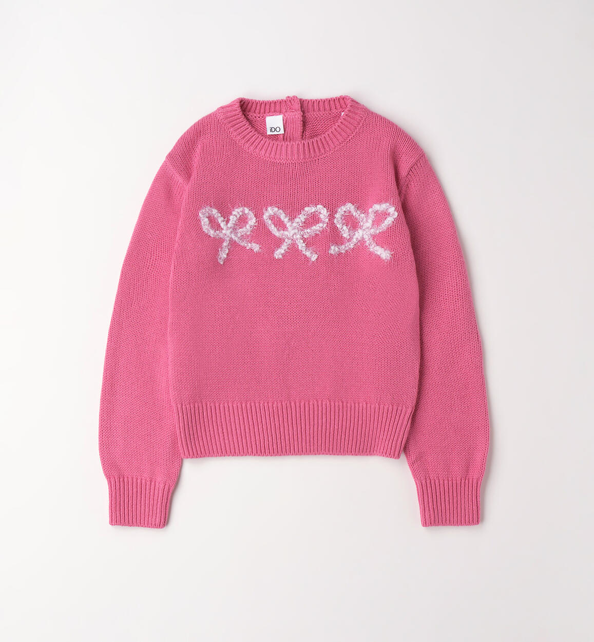 Pink iDO sweater for girls made from cotton tricot with intarsia embroidery of bows, embellished with lurex thread. By choosing our cotton products, you support iDO's commitment to the Better Cotton mission. This product is supplied through a mass balance system and may not contain Better Cotton. Read more at bettercotton.org/massbalance