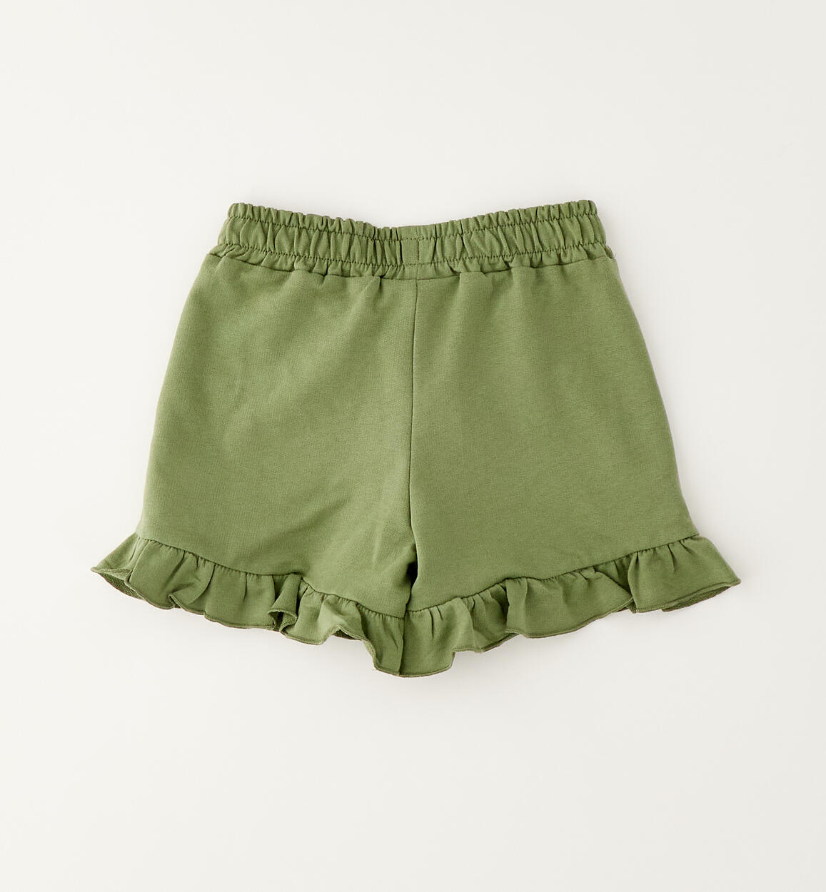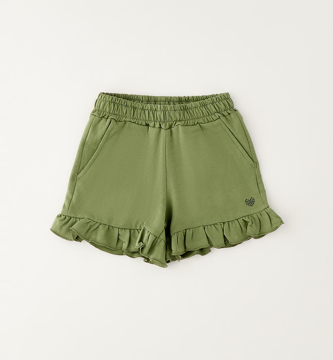 iDO girls' shorts made from 100% cotton fleece. Ruffles at the bottom, elasticated waistband with drawstring and pockets. Small rhinestone heart. By choosing our cotton products, you support iDO's commitment to the Better Cotton mission. This product is supplied through a mass balance system and may not contain Better Cotton. Read more at bettercotton.org/massbalance