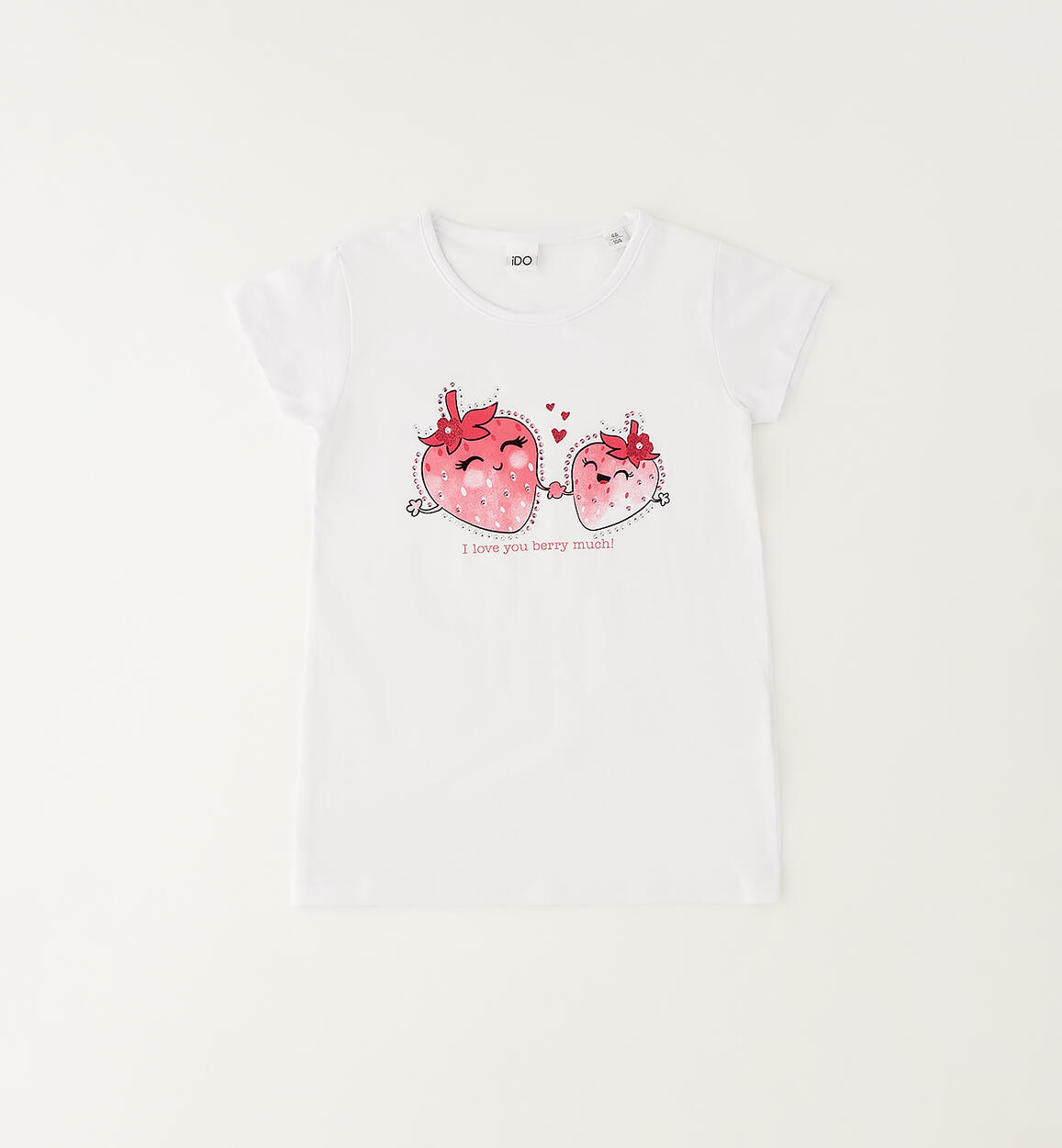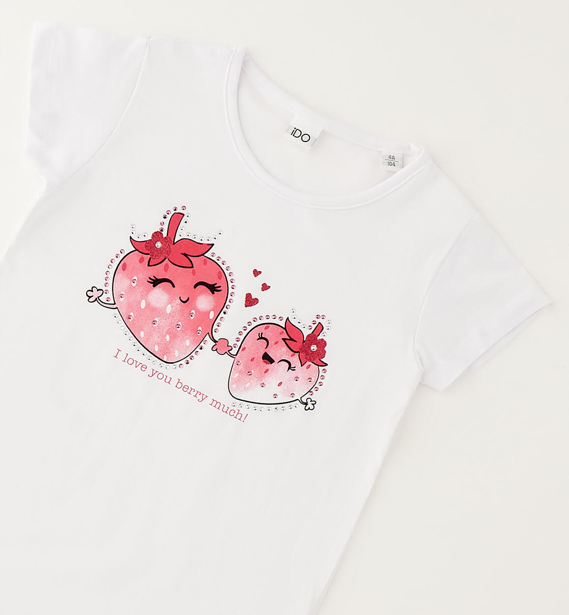 iDO girls' T-shirt made from stretch cotton jersey with strawberry print, glitter details, and rhinestones. By choosing our cotton products, you support iDO's commitment to the Better Cotton mission. This product is supplied through a mass balance system and may not contain Better Cotton. Read more at bettercotton.org/massbalance