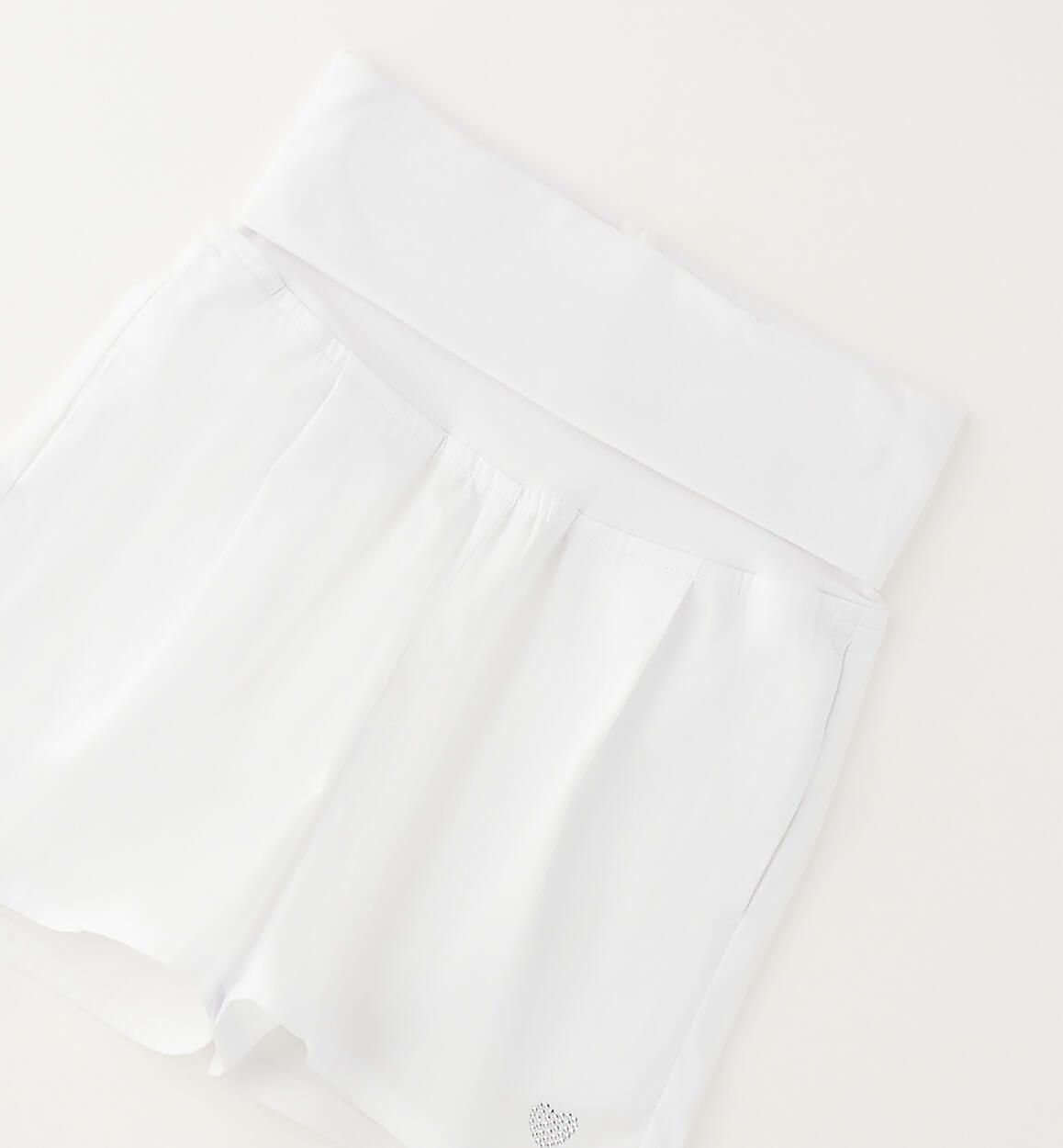 iDO girls' shorts made from lightweight poplin with a stretch jersey waistband. Rhinestone heart at the hem. By choosing our cotton products, you support iDO's commitment to the Better Cotton mission. This product is supplied through a mass balance system and may not contain Better Cotton. Read more at bettercotton.org/massbalance