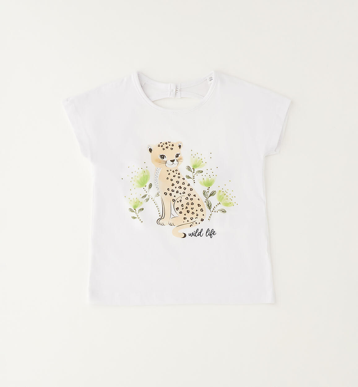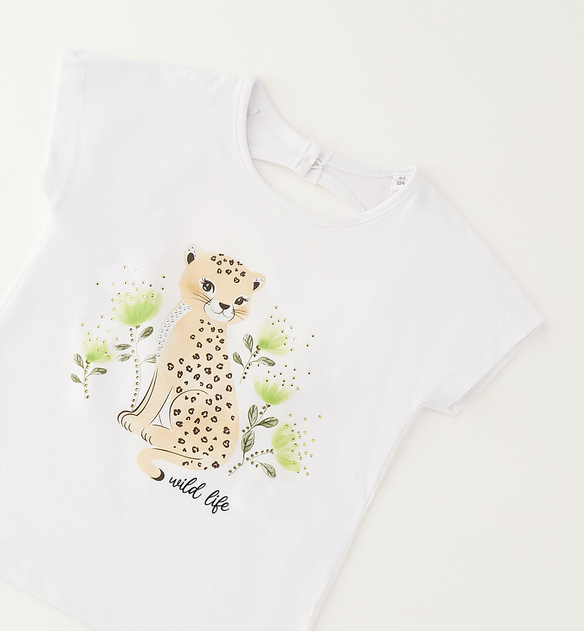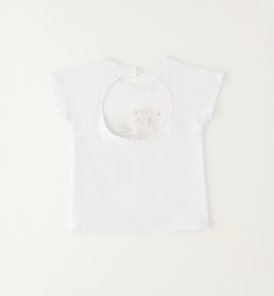 iDO girls' T-shirt made from stretch cotton jersey. Front print with rhinestones. Model with circle opening on the back. By choosing our cotton products, you support iDO's commitment to the Better Cotton mission. This product is supplied through a mass balance system and may not contain Better Cotton. Read more at bettercotton.org/massbalance