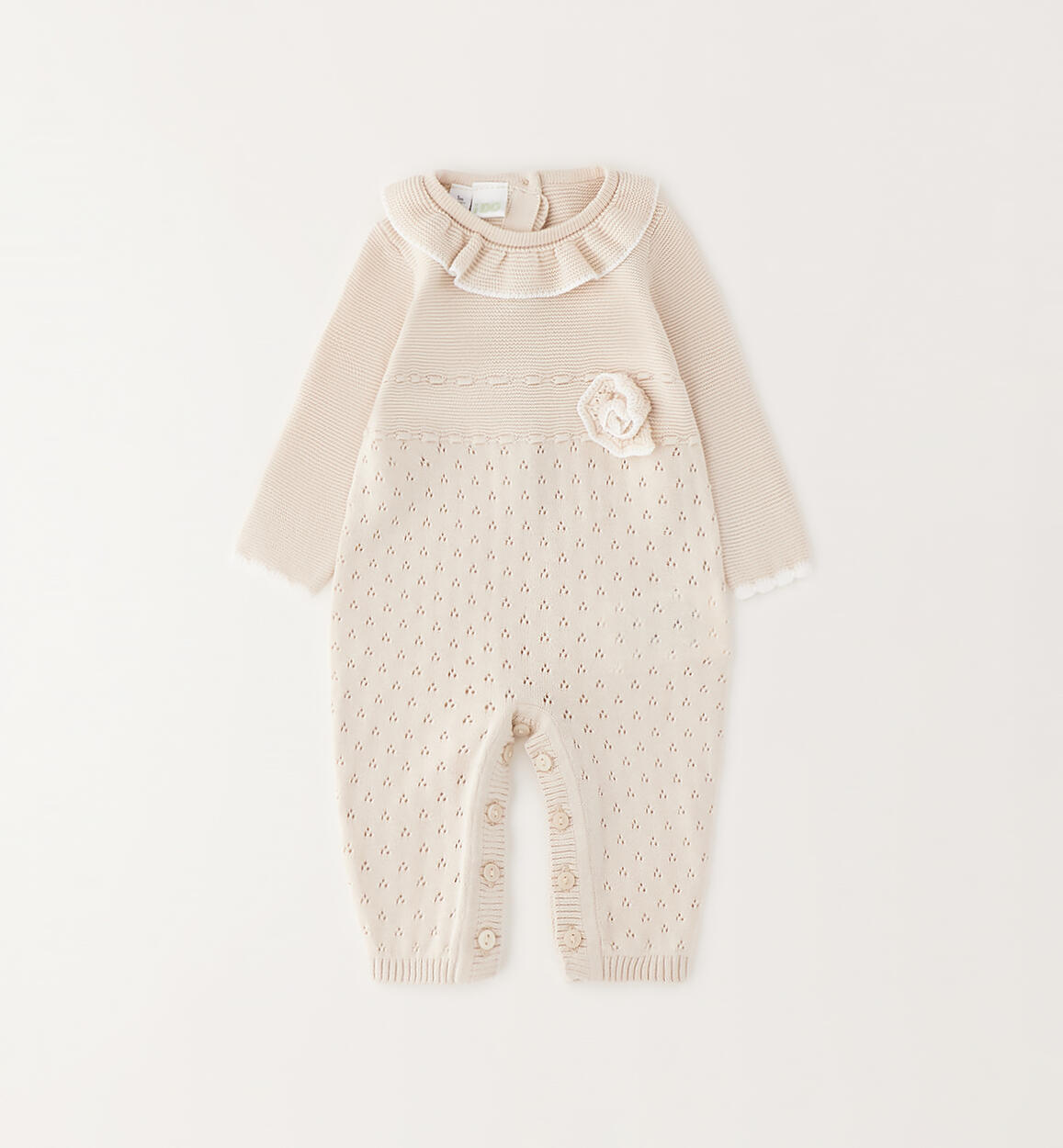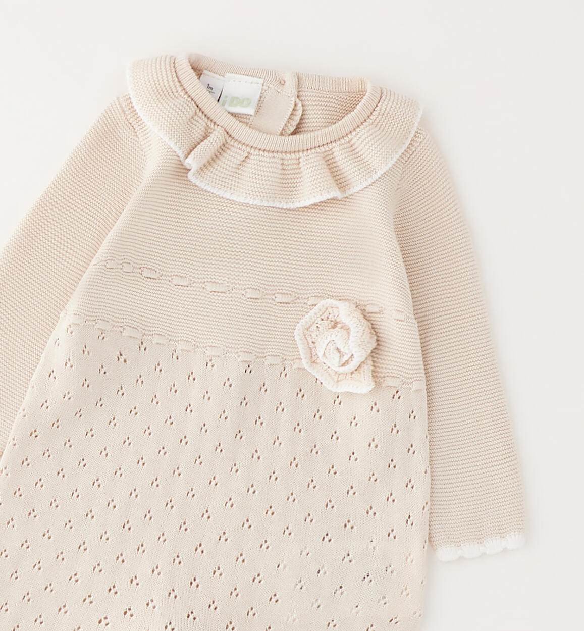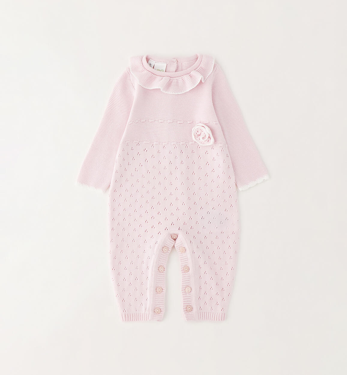 iDO baby girl's romper suit, 0-18 months, made from 100% cotton openwork tricot with appliqué flower. Collared design. Opening at the back and under the legs with buttons for easy changing and dressing. By choosing our cotton products, you support our investment in the Better Cotton mission. This product is supplied through a mass balance system and may not contain Better Cotton. Read more at bettercotton.org/massbalance