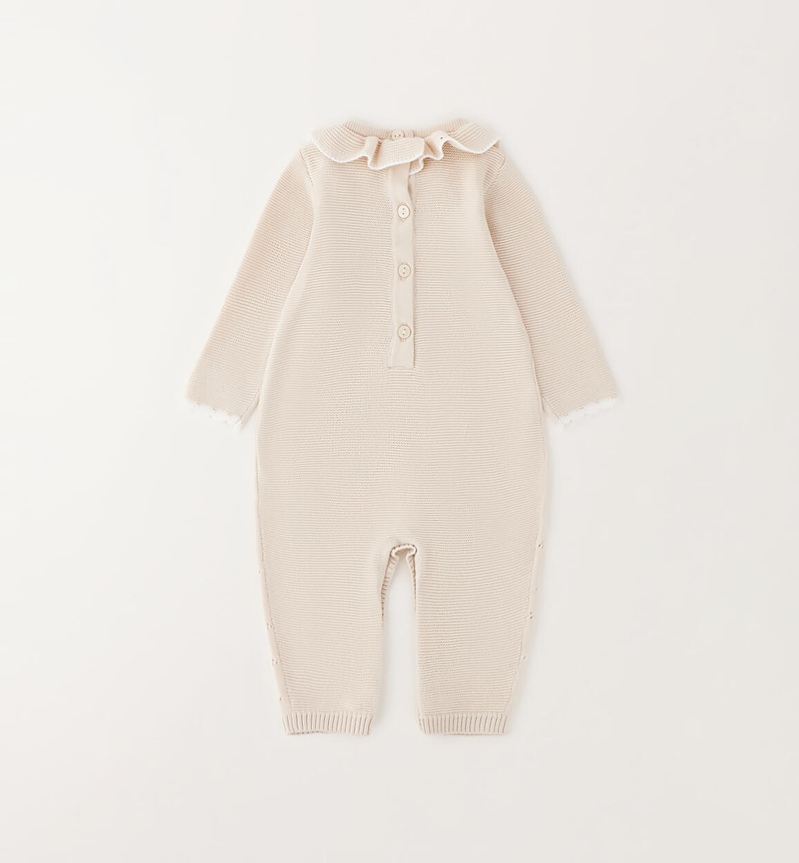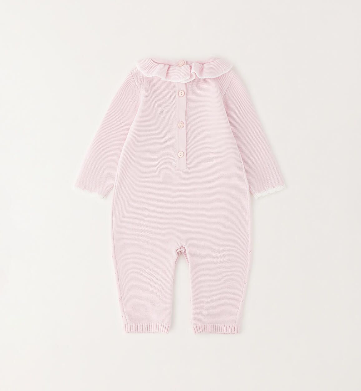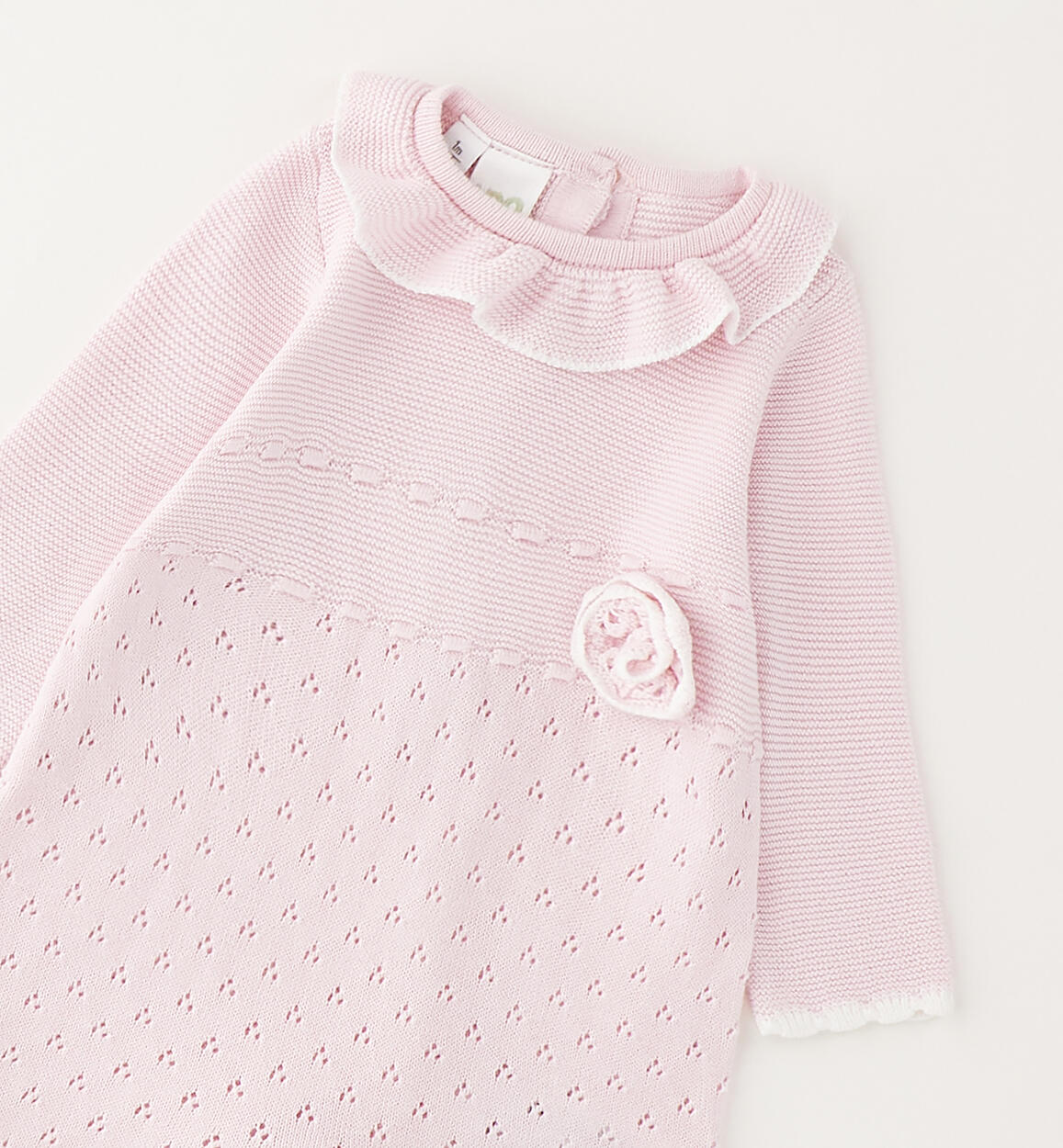 iDO baby girl's romper suit, 0-18 months, made from 100% cotton openwork tricot with appliqué flower. Collared design. Opening at the back and under the legs with buttons for easy changing and dressing. By choosing our cotton products, you support our investment in the Better Cotton mission. This product is supplied through a mass balance system and may not contain Better Cotton. Read more at bettercotton.org/massbalance