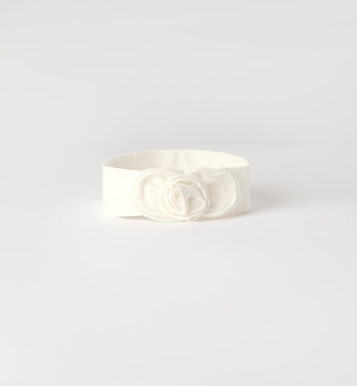 iDO baby girl hair band. Made from cotton jersey, it is embellished with a bow and flower appliqué. By choosing our cotton products, you are supporting iDO's commitment to the Better Cotton mission. This product is supplied through a mass balance system and may not contain Better Cotton. Read more at bettercotton.org/massbalance