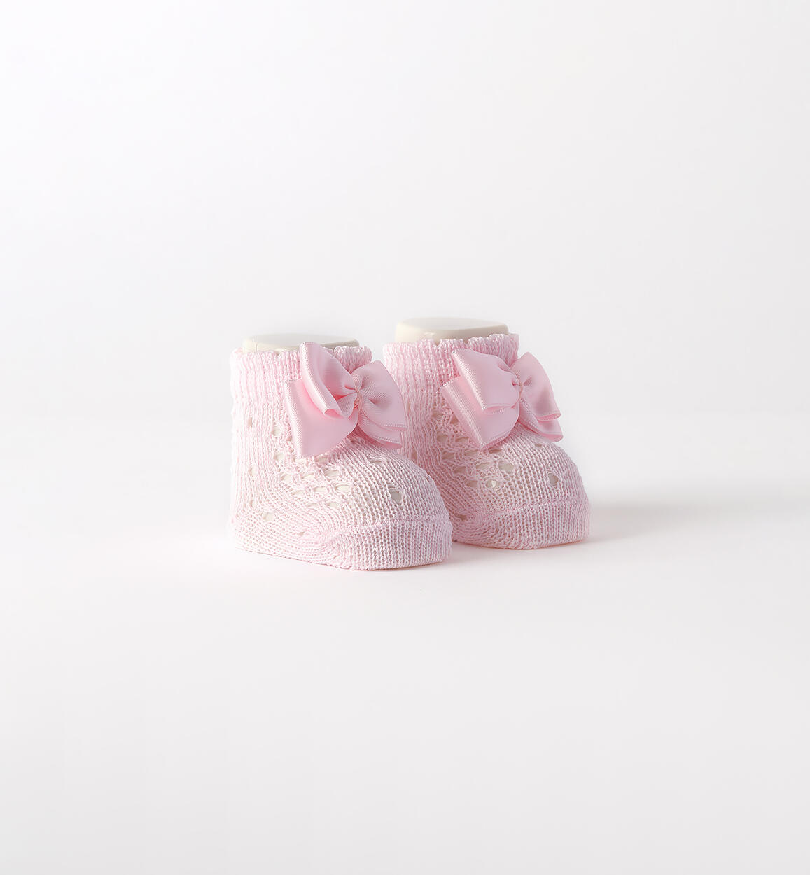 iDO baby girl socks made from openwork tricot with bow appliqué. The socks come in a transparent box. By choosing our cotton products, you support our investment in the Better Cotton mission. This product is supplied through a mass balance system and may not contain Better Cotton. Read more at bettercotton.org/massbalance