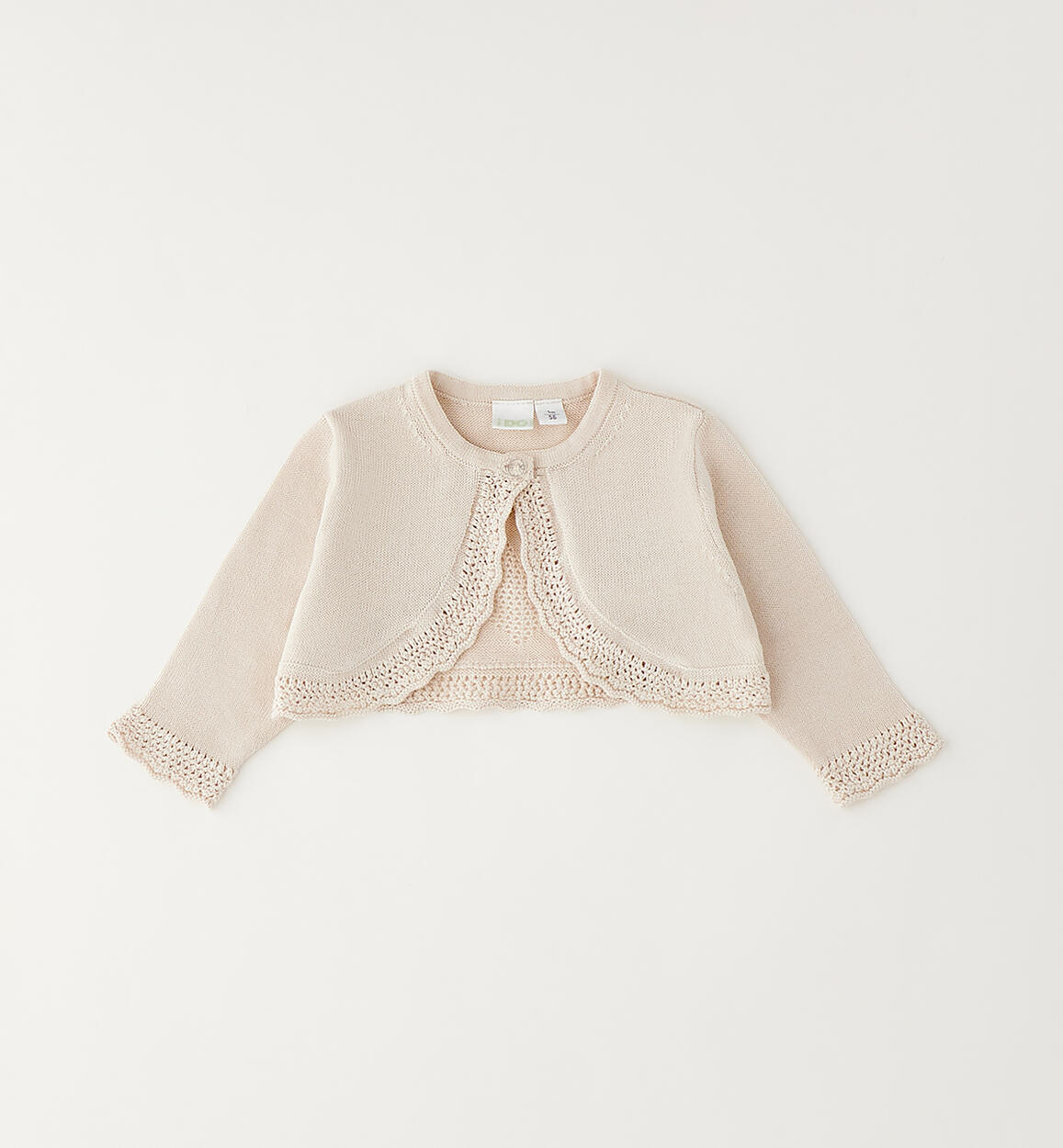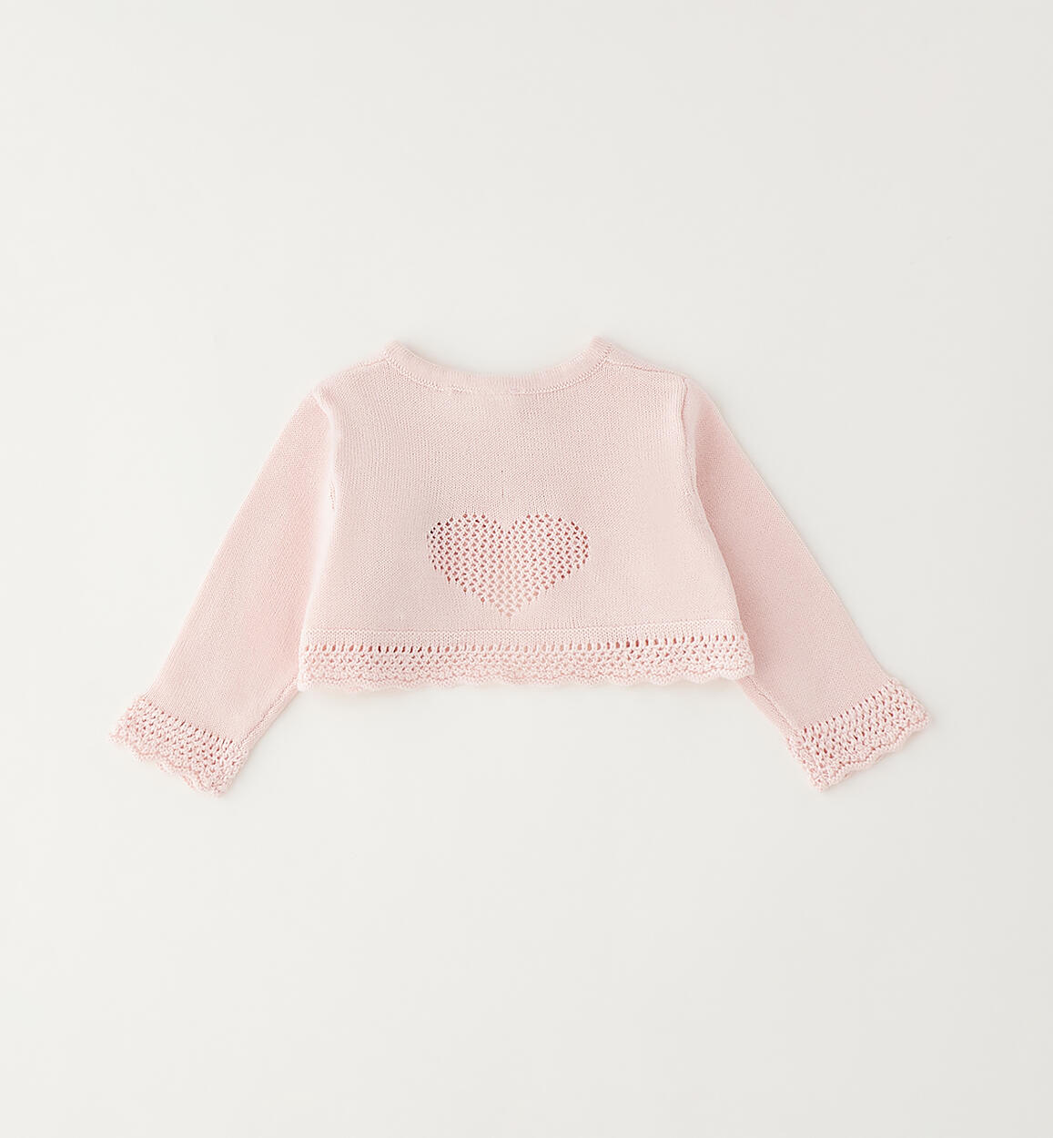 iDO cardigan for girls aged 1 to 24 months, made from 100% cotton tricot with openwork details and a heart on the back. Button fastening. By choosing our cotton products, you support our investment in the Better Cotton mission. This product is supplied through a mass balance system and may not contain Better Cotton. Read more at bettercotton.org/massbalance
