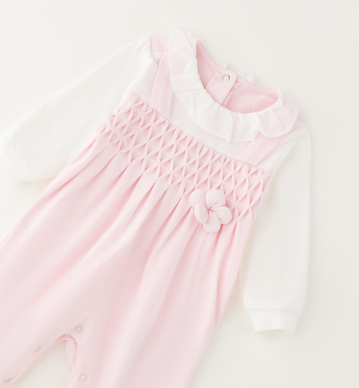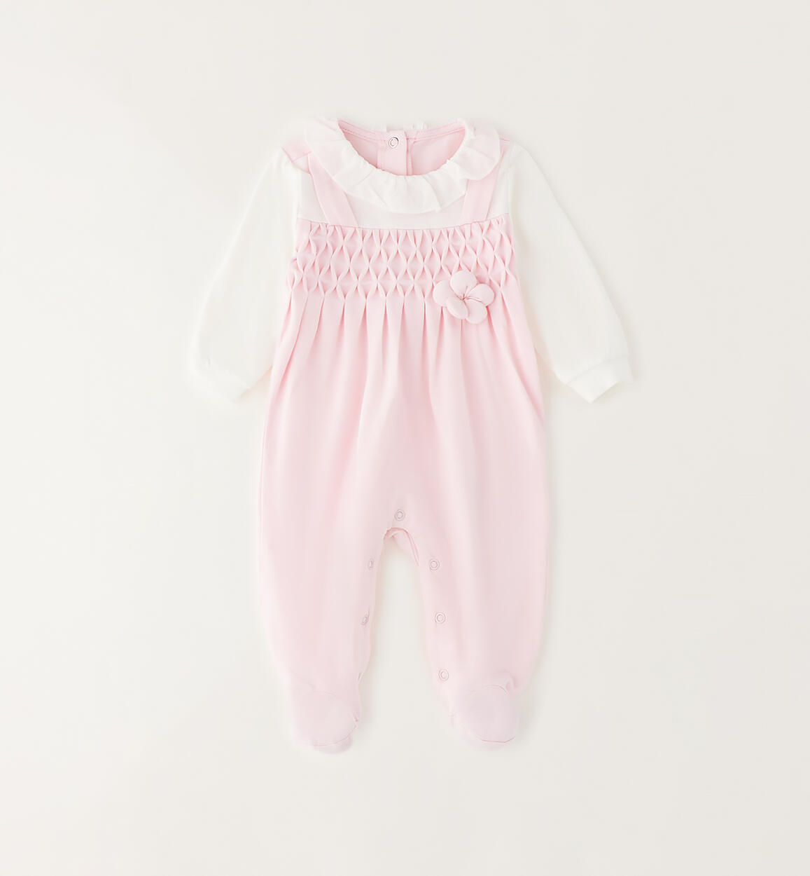 Pink iDO babygrow for girls aged 0 to 18 months, made from stretch cotton jersey. Faux dungaree style with collar and flower appliqué. Press stud fastening at the back and under the legs for easy changing and dressing. By choosing our cotton products, you are supporting our investment in the Better Cotton mission. This product is supplied through a mass balance system and may not contain Better Cotton. Read more at bettercotton.org/massbalance