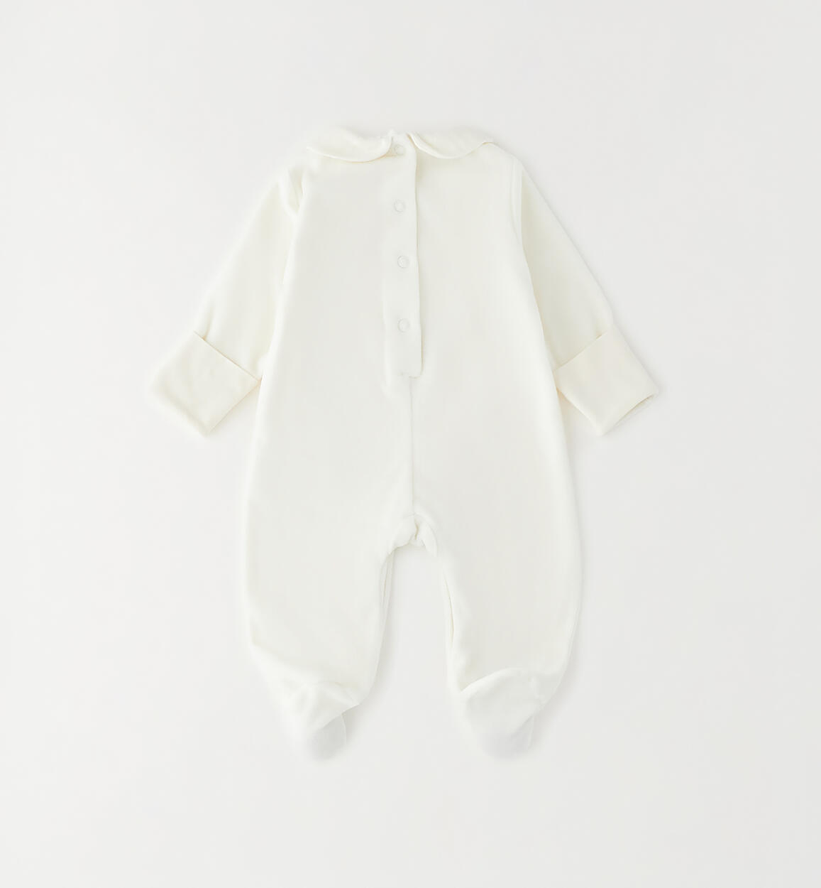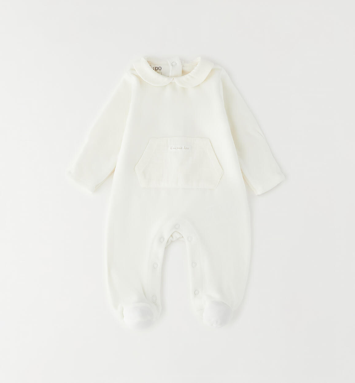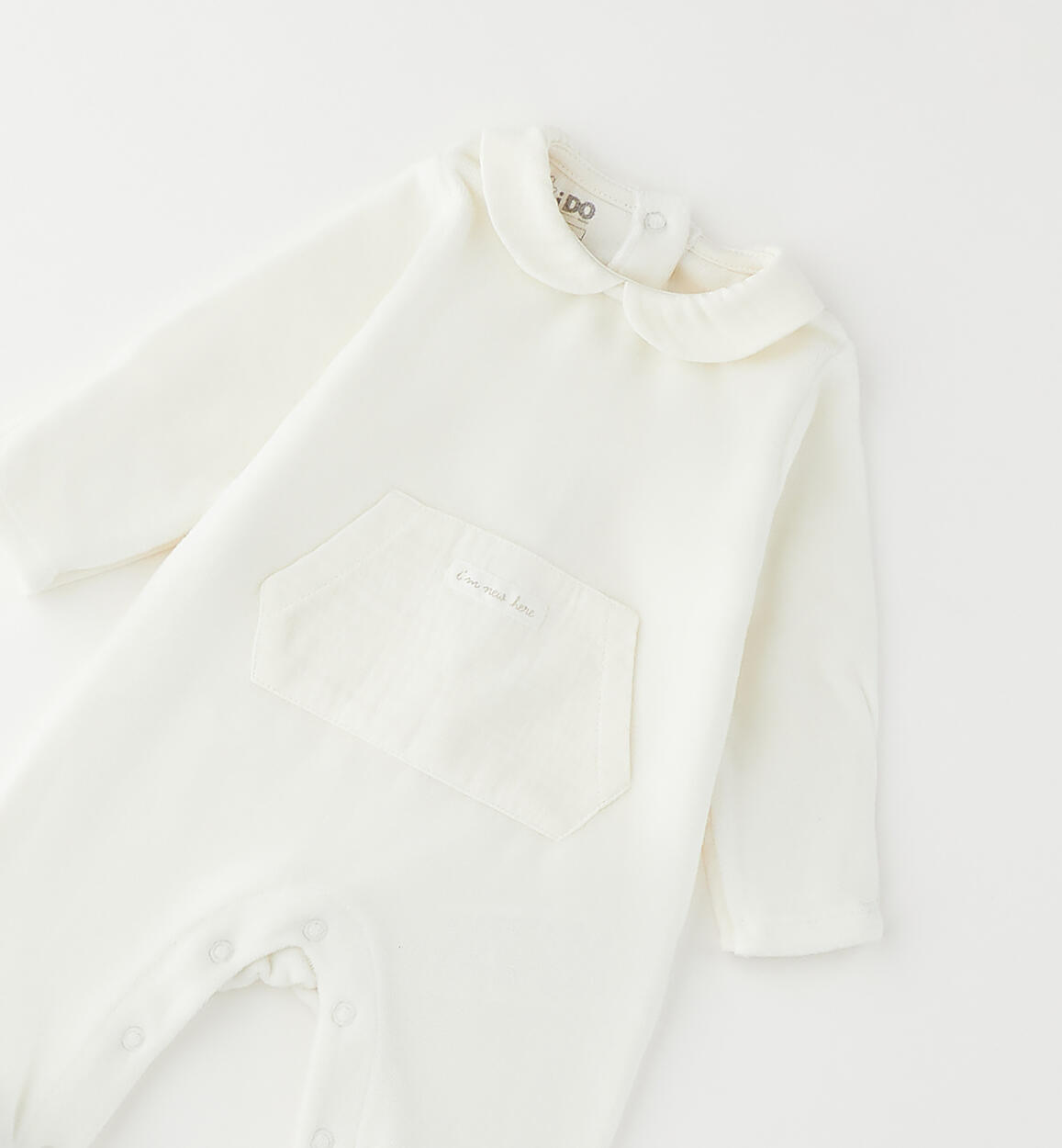 iDO 0-18 months chenille baby romper with muslin collar and front pocket. The design features press studs at the back and under the legs for easy changing and dressing. Unisex design. By choosing our cotton products, you support our investment in the Better Cotton mission. This product is supplied through a mass balance system and may not contain Better Cotton. Read more at bettercotton.org/massbalance