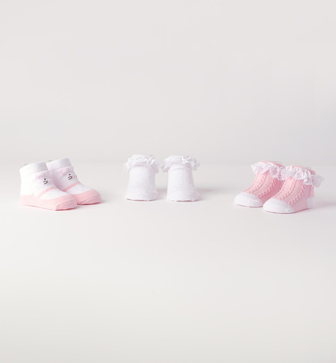 Set of three iDO baby girl socks made from cotton. By choosing our cotton products, you are supporting iDO's commitment to the Better Cotton mission. The socks are packaged in a transparent box. This product is supplied through a mass balance system and may not contain Better Cotton. Read more at bettercotton.org/massbalance