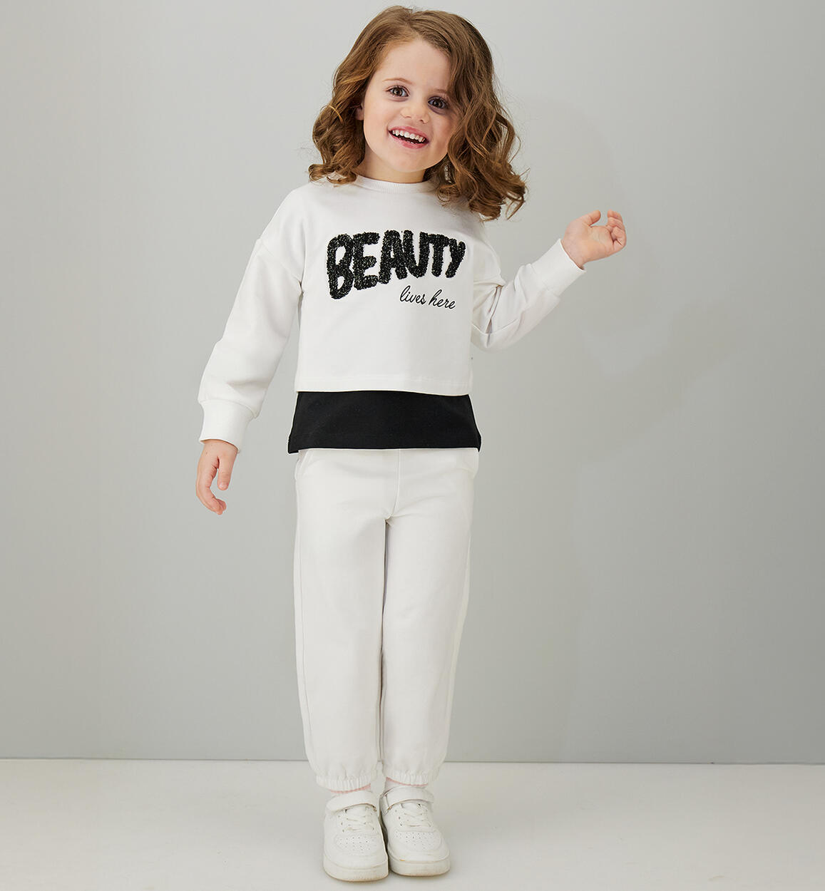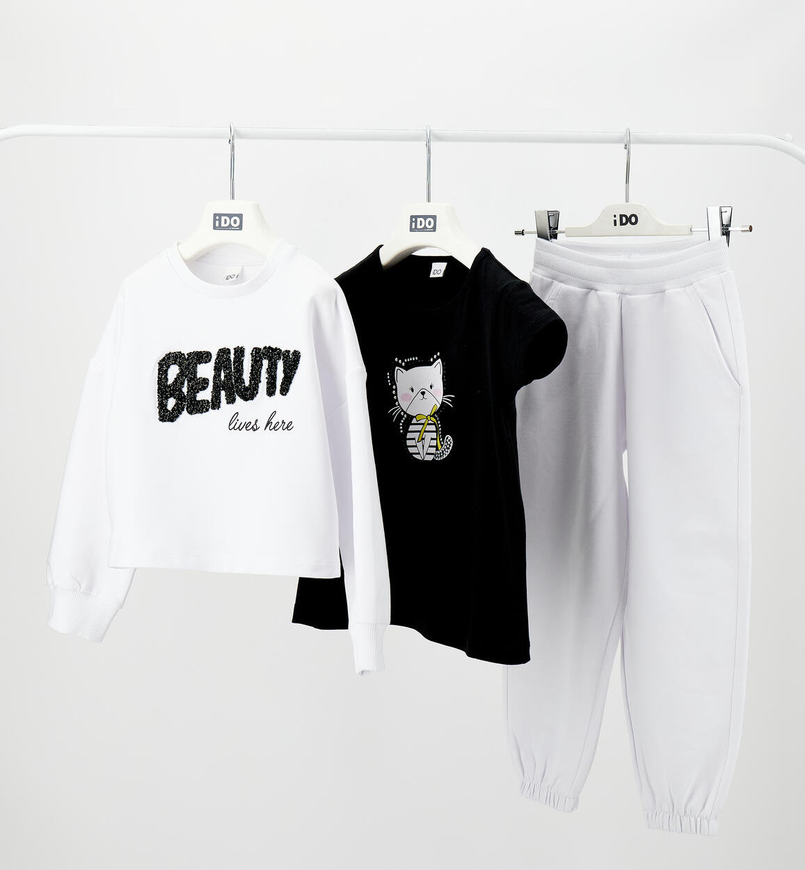 Three-piece set for girls by iDO in stretch cotton. The set consists of a tracksuit and T-shirt. The sweatshirt is made from French terry with glitter print and terry embroidery. Stretch jersey T-shirt with kitten print and rhinestones. Sweatshirt pants with elastic waistband and drawstring. Elastic at the bottom of the legs. By choosing our cotton products, you support iDO's commitment to the Better Cotton mission. This product is supplied through a mass balance system and may not contain Better Cotton. Read more at bettercotton.org/massbalance