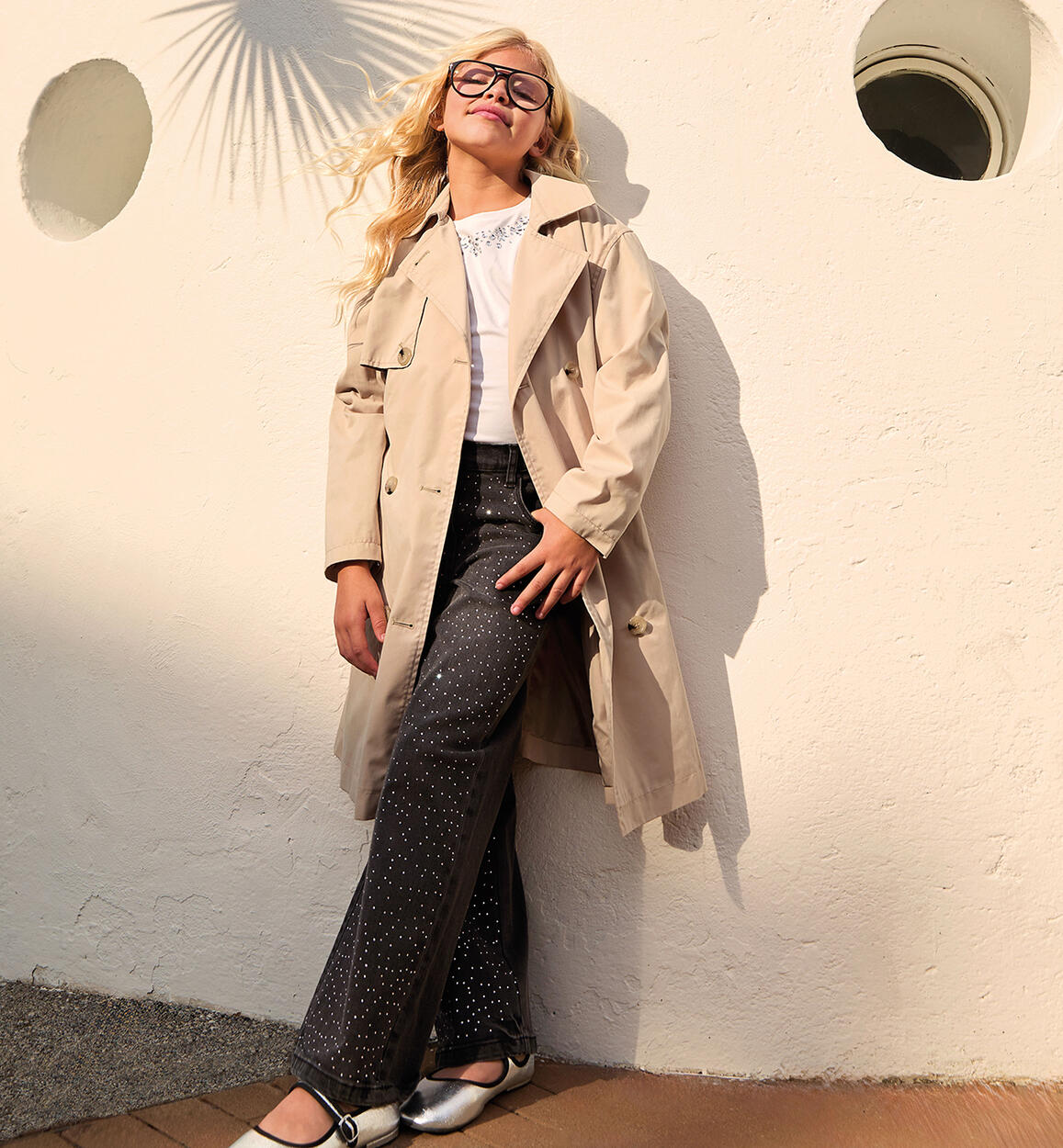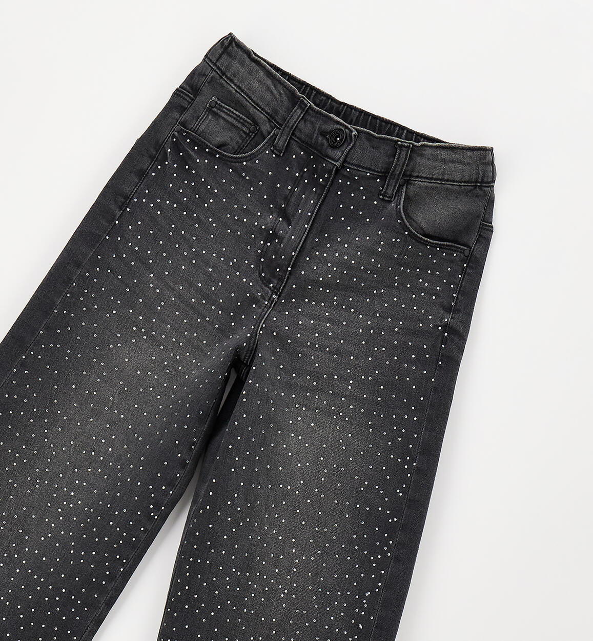 Long stretch cotton denim pants for girls by iDO, embellished with rhinestones. Zip and button closure. Adjustable waist with internal elastic. Wide fit.