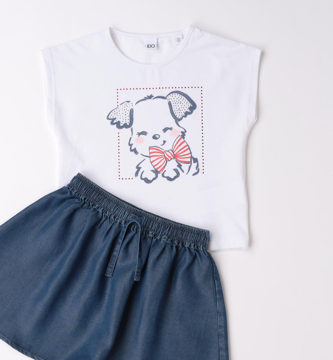 iDO short-sleeved outfit for girls. Stretch cotton jersey T-shirt with dog print and rhinestones. 100% lyocell skirt with elasticated waist and drawstring. Above-the-knee length. By choosing our cotton products, you are supporting iDO's commitment to the Better Cotton mission. This product is supplied through a mass balance system and may not contain Better Cotton. Read more at bettercotton.org/massbalance
