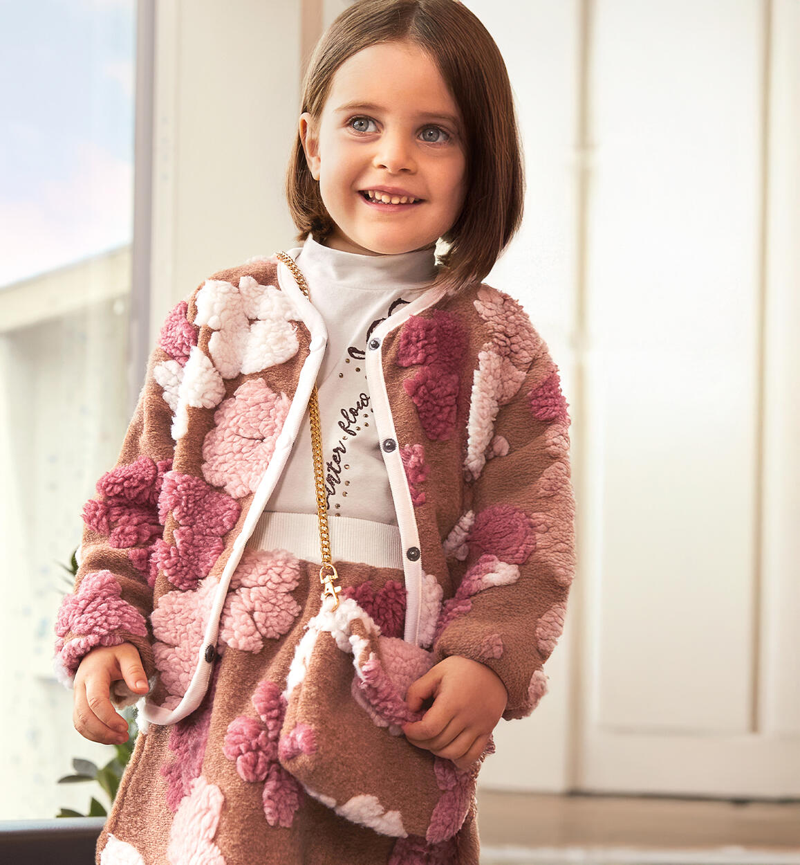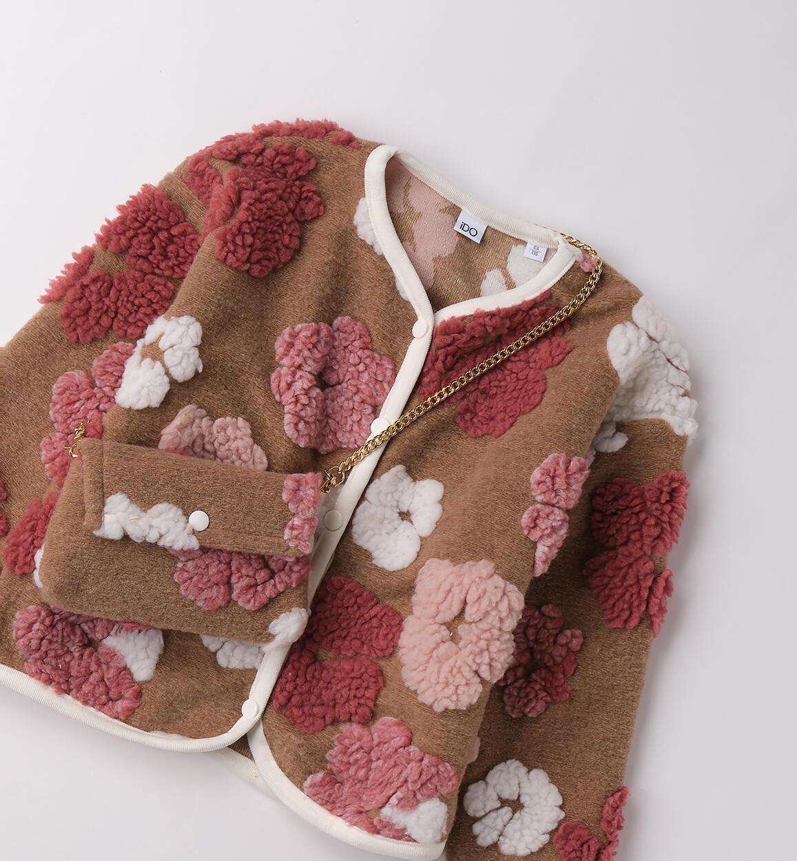 iDO girl's jacket made from special fabric with floral embroidery. Button closure. Matching shoulder bag. Detachable strap. Height 9 cm, length approx. 16 cm.