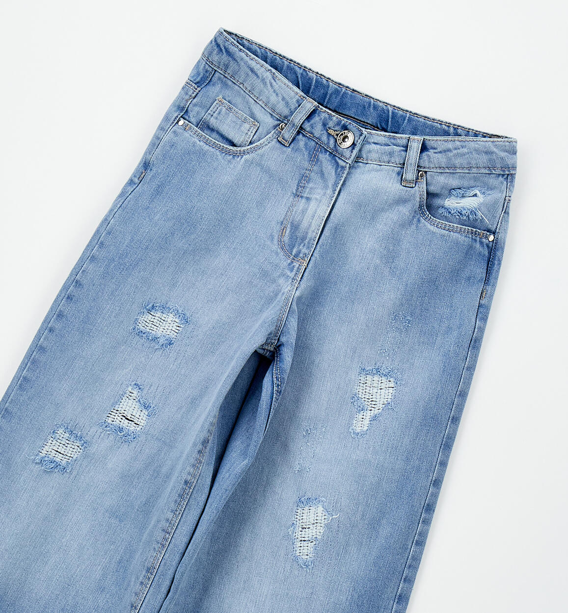 Long 100% cotton denim pants for girls by iDO. Style embellished with rips and inner lining. Zip and button closure. Adjustable waist with inner elastic. Wide fit.