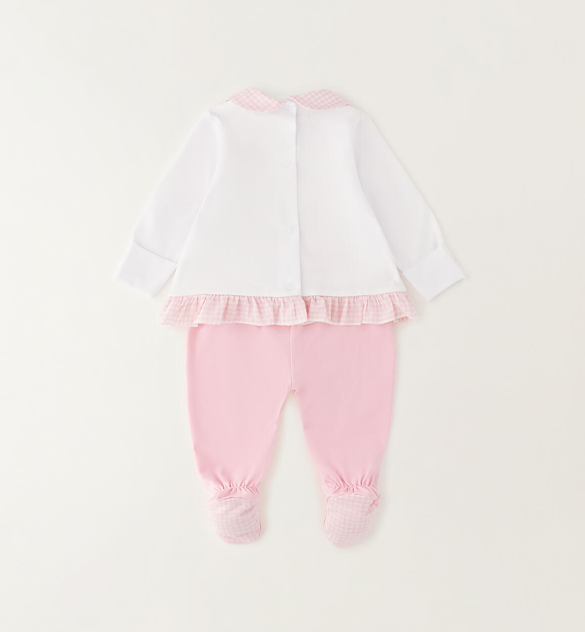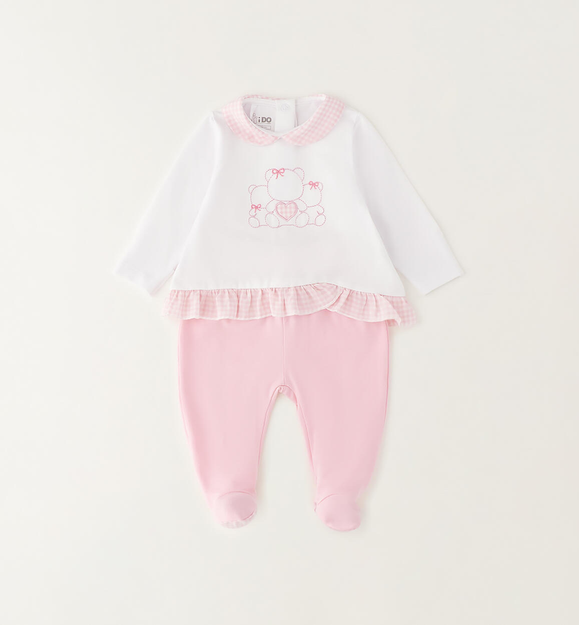 iDO two-piece romper suit for newborns aged 0 to 12 months, made from stretch cotton jersey. The hospital outfit is made from stretch cotton jersey. The top is embellished with embroidery on the front and a press stud opening at the back. The trousers have an elasticated waistband. By choosing our cotton products, you are supporting our investment in the Better Cotton mission. This product is supplied through a mass balance system and may not contain Better Cotton. Read more at bettercotton.org/massbalance