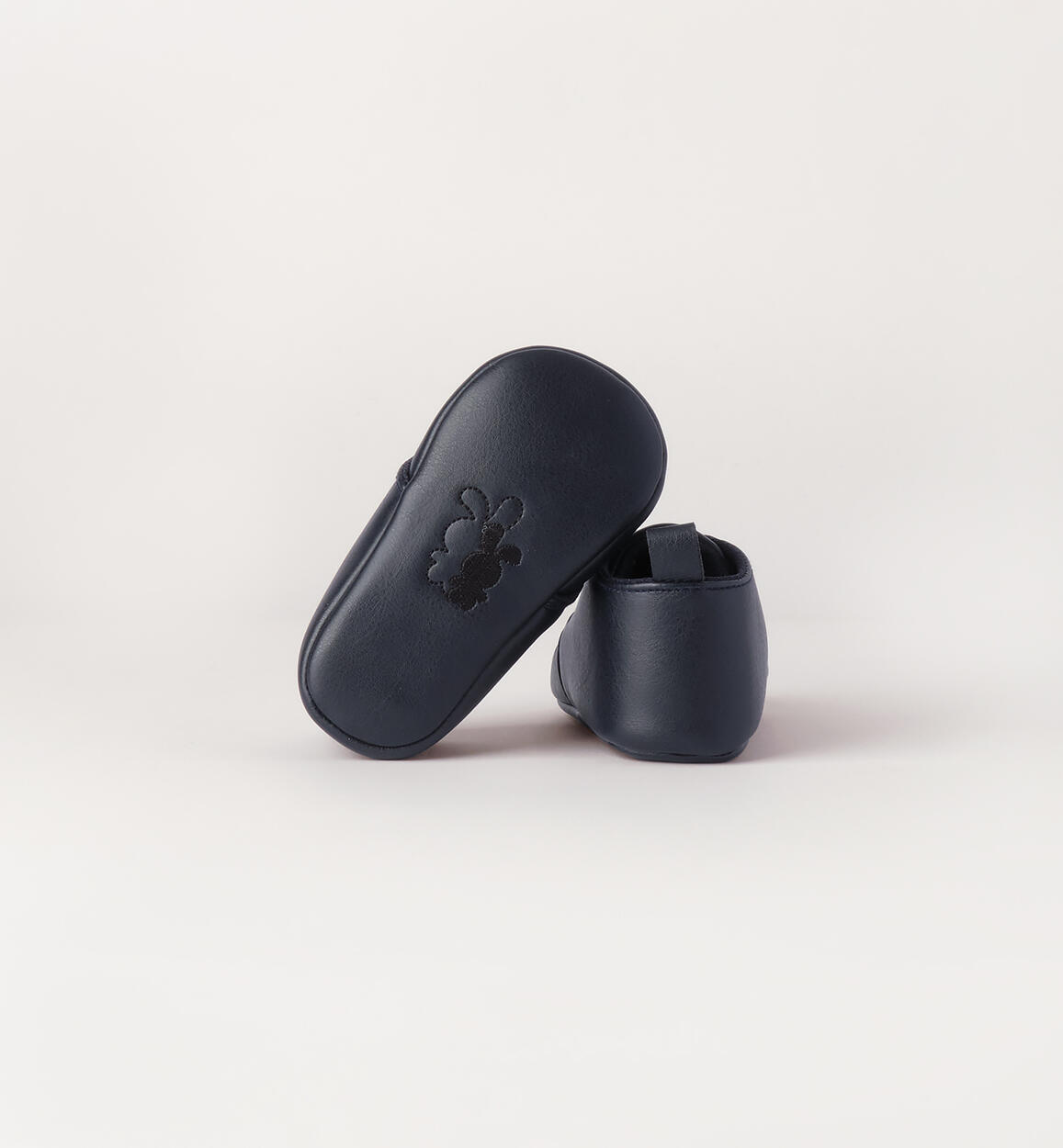 Blue formal shoes for newborns by iDO, made from shiny fabric and packaged in a practical box.