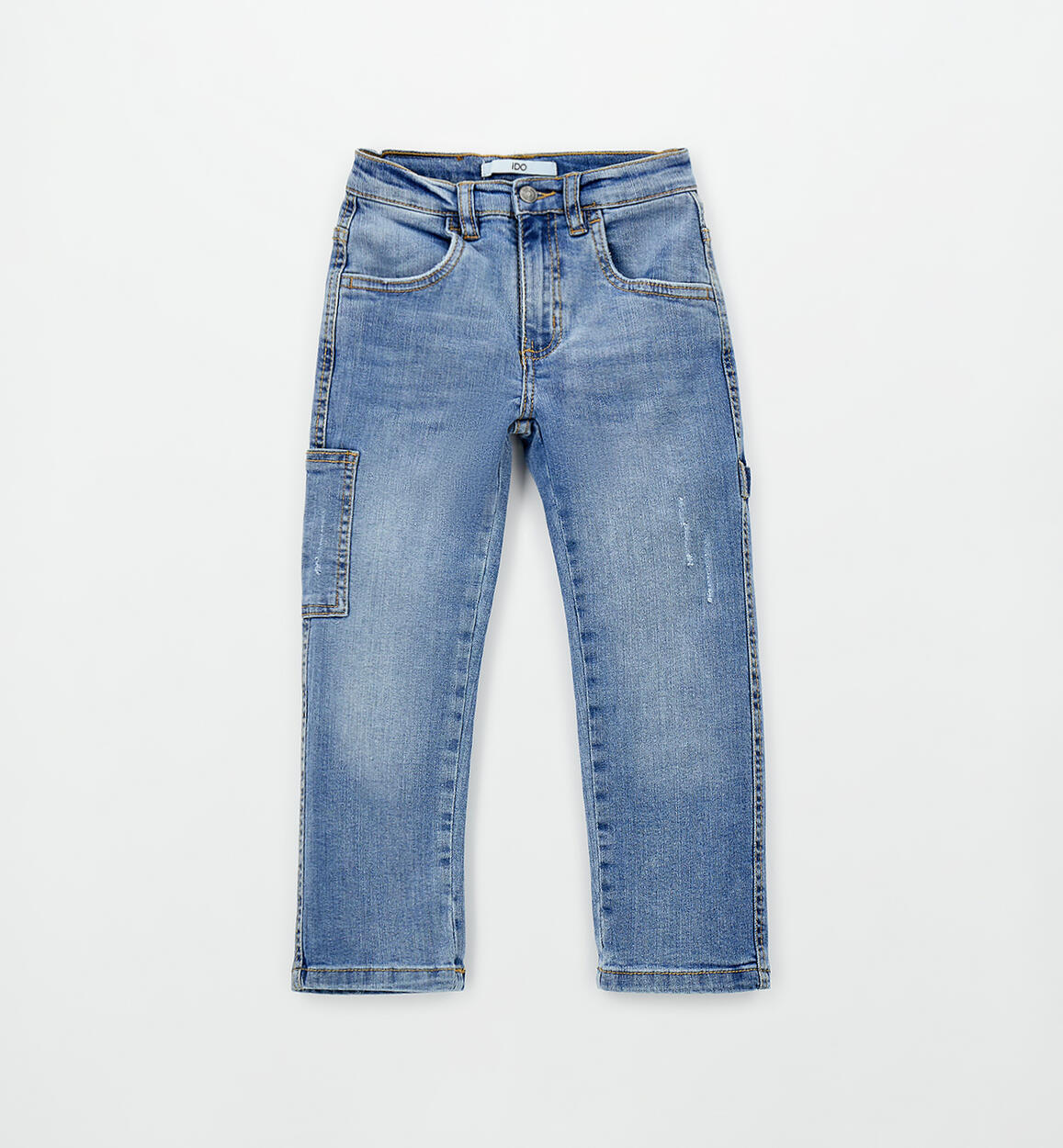 Long stretch cotton denim trousers for children by iDO. Straight fit. Zip and button fastening. Light distressing. Side pocket. Adjustable waist with internal elasticated drawstring. By choosing our cotton products, you are supporting iDO's commitment to the Better Cotton Initiative. This product is supplied through a mass balance system and may not contain Better Cotton. Read more at bettercotton.org/massbalance