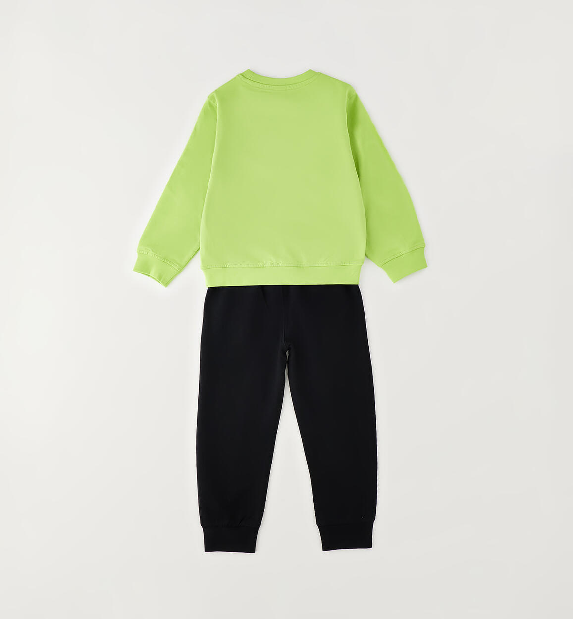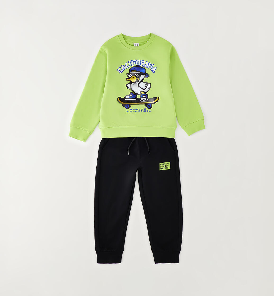 iDO two-piece jogging suit for children made from lightweight 100% cotton fleece. Crew neck sweatshirt with print on the front and pocket on the sleeve. Trousers with elasticated waist and drawstring. Cuffs at the bottom of the legs. By choosing our cotton products, you are supporting iDO's commitment to the Better Cotton mission. This product is supplied through a mass balance system and may not contain Better Cotton. Read more at bettercotton.org/massbalance