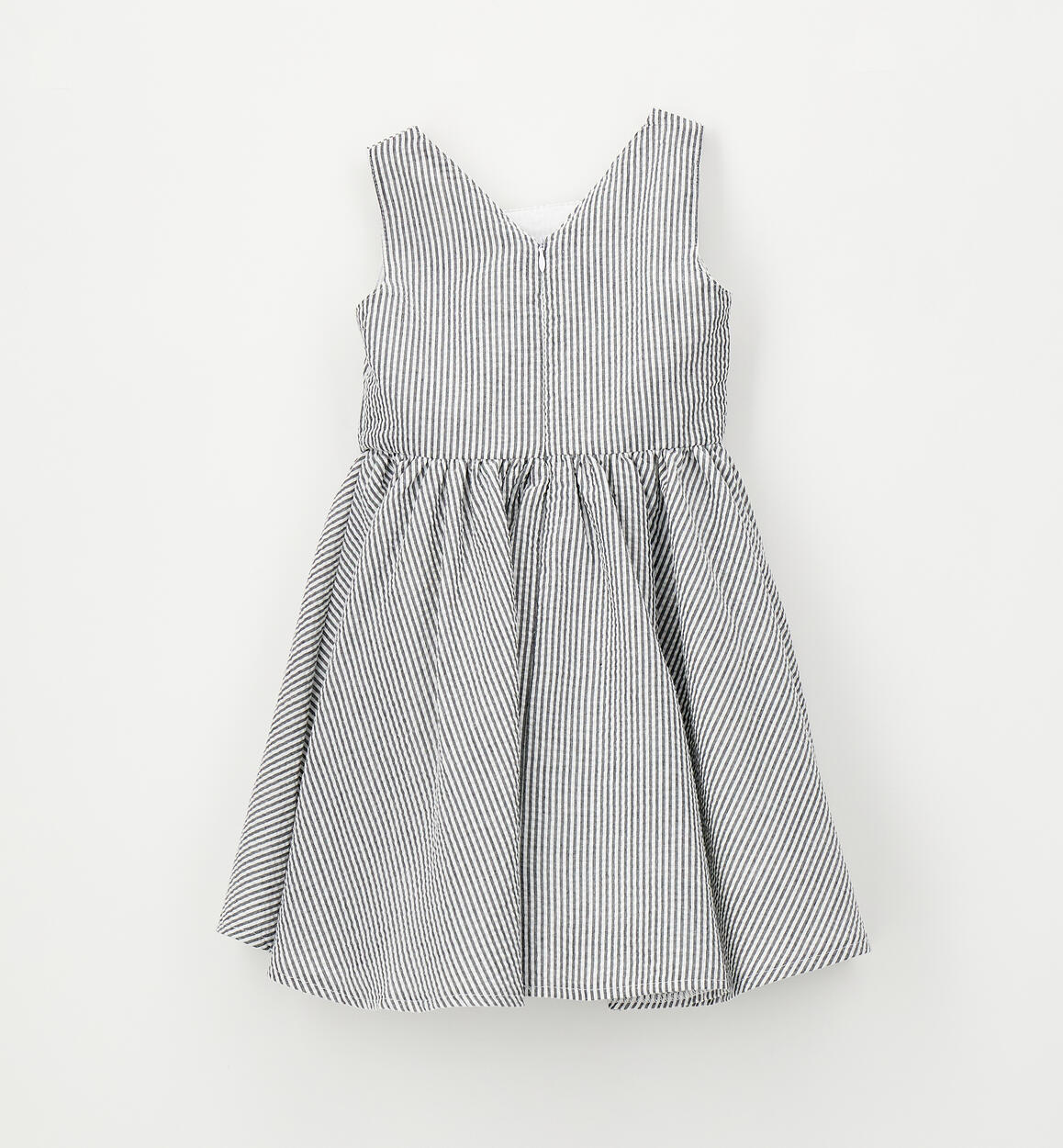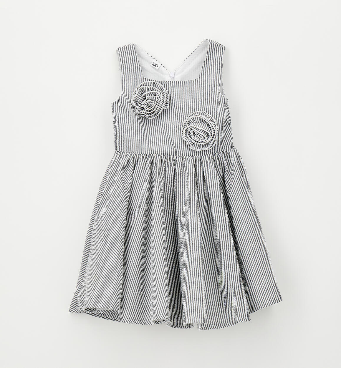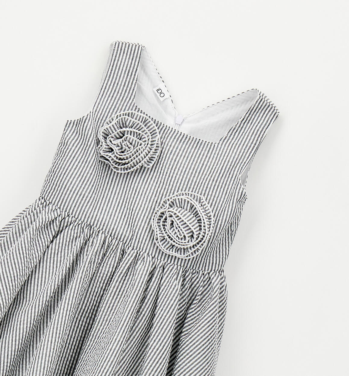 iDO sleeveless dress for girls made from striped seersucker with cotton lining. Appliqué flowers. Knee length. Invisible zip fastening at the back.