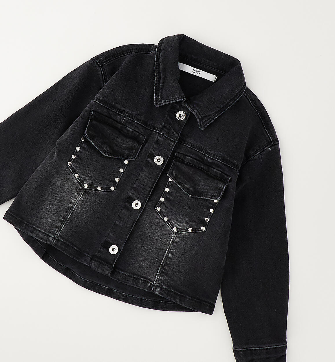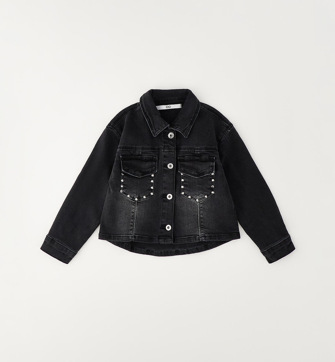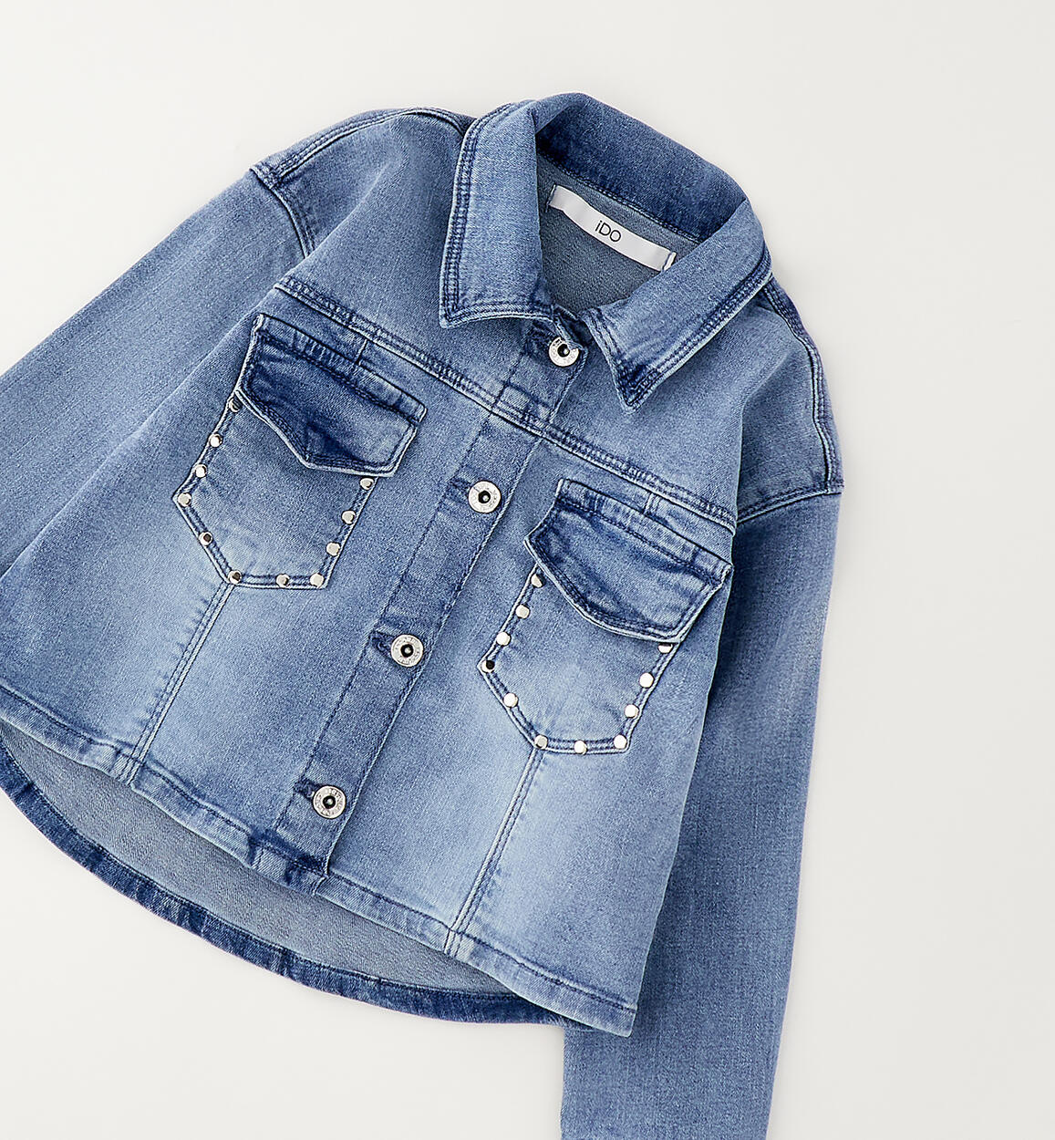 iDO girls' jacket made from super-stretch denim with pockets embellished with small studs. Button fastening. By choosing our cotton products, you support iDO's commitment to the Better Cotton mission. This product is supplied through a mass balance system and may not contain Better Cotton. Read more at bettercotton.org/massbalance