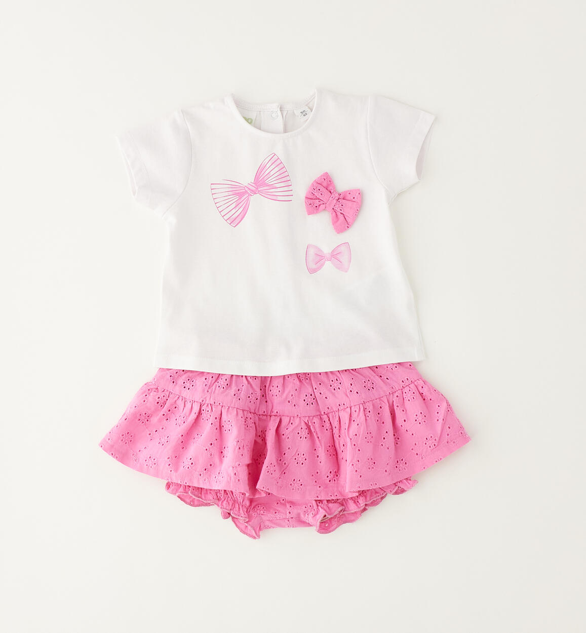 Cute iDO outfit for girls aged 1 to 24 months, made from cotton. The T-shirt is in stretch jersey with a press stud fastening at the back. The front is embellished with a bow print and bow appliqué to match the shorts. Skirt-effect shorts made from broderie anglaise fabric. By choosing our cotton products, you are supporting our investment in the Better Cotton mission. This product is supplied through a mass balance system and may not contain Better Cotton. Read more at bettercotton.org/massbalance