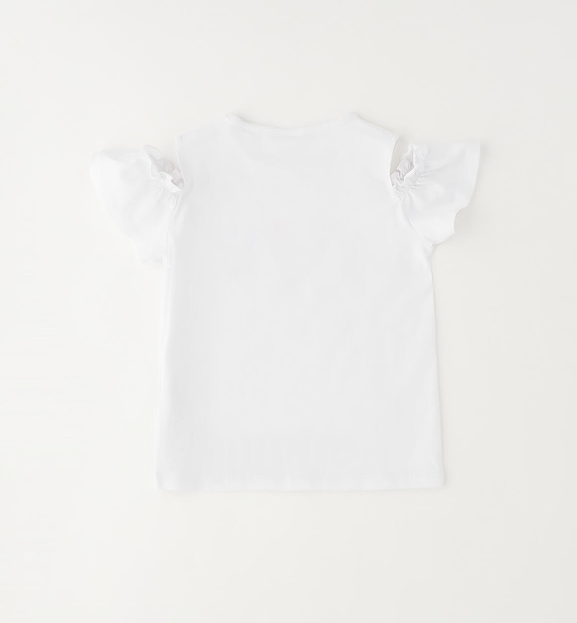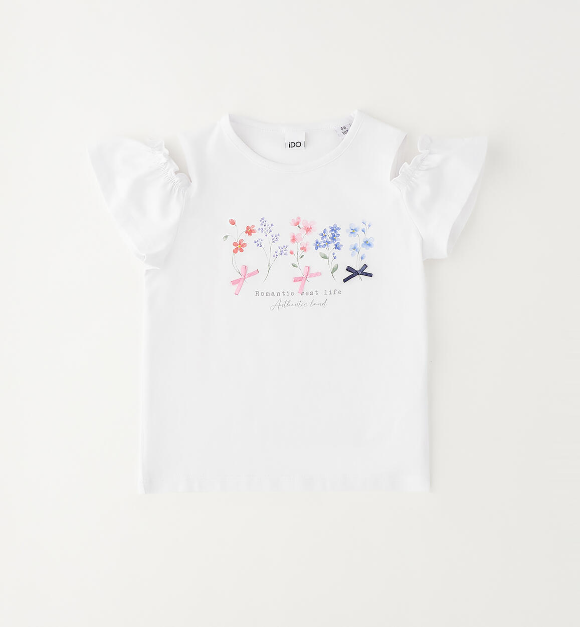 iDO girls' T-shirt in stretch cotton jersey with unique sleeves that leave the shoulders bare. Print on the front and small bow appliqués. By choosing our cotton products, you support iDO's commitment to the Better Cotton mission. This product is supplied through a mass balance system and may not contain Better Cotton. Read more at bettercotton.org/massbalance