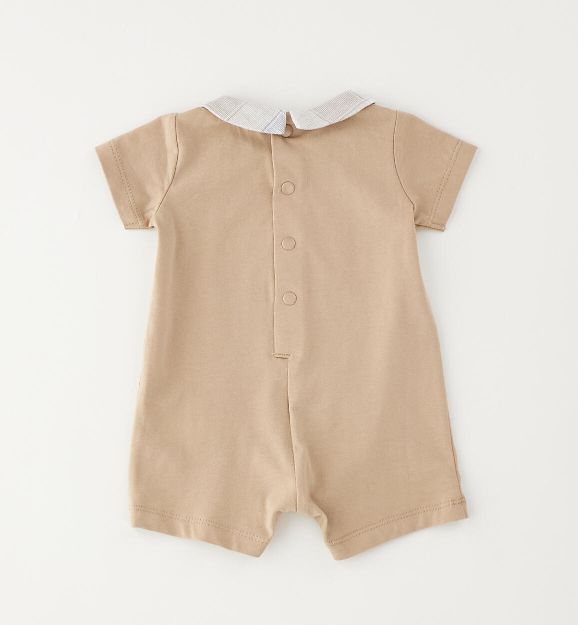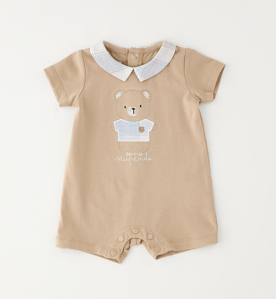 iDO romper suit for babies aged 0 to 18 months, made from stretch cotton jersey with a collar. The front is embellished with printed lettering and embroidery. The design features press studs at the back and under the legs for easy changing and dressing.