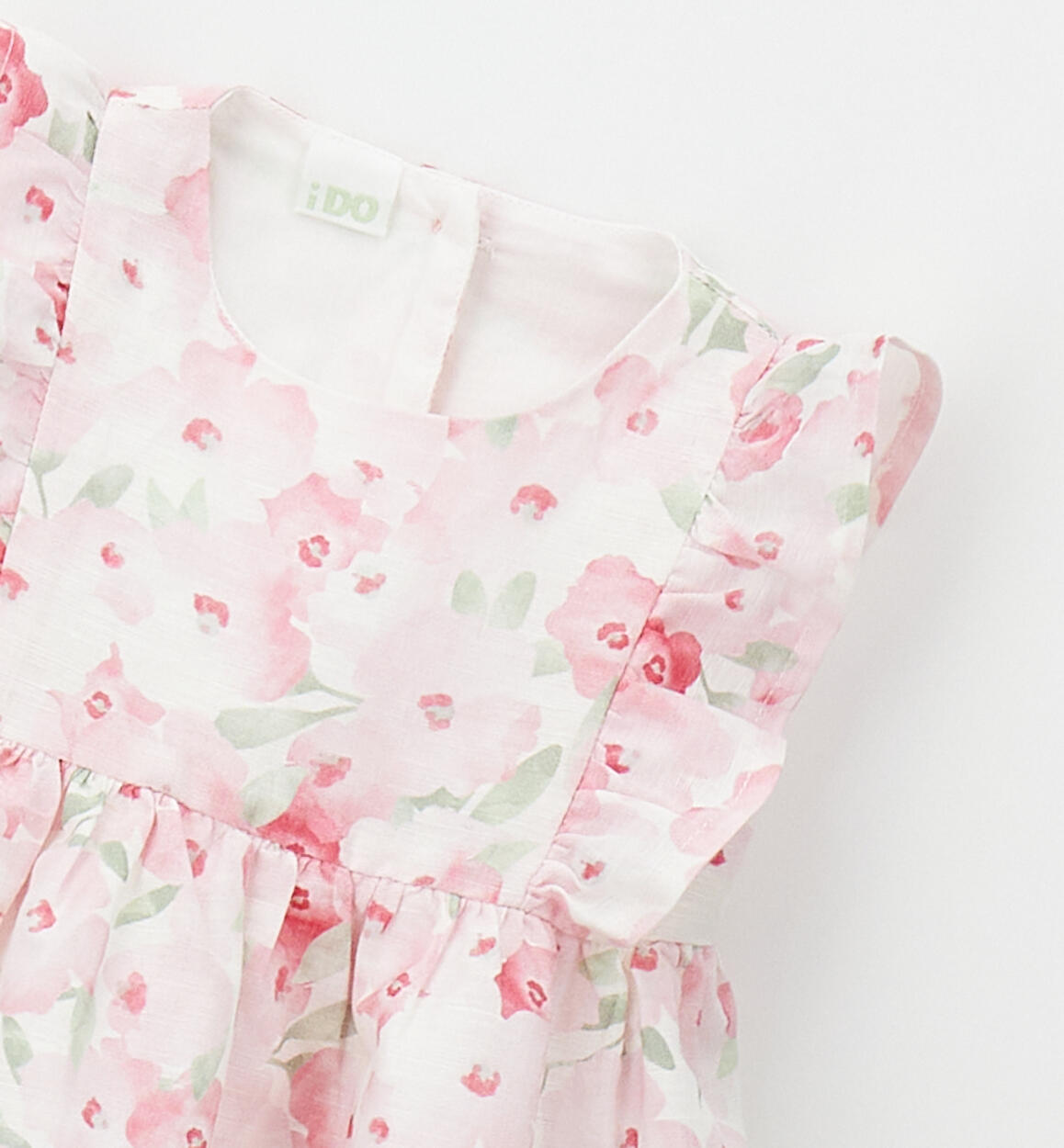 iDO linen and cotton dress for girls aged 1 to 24 months with floral pattern. Cotton lining. Above-the-knee length. Back opening with buttons