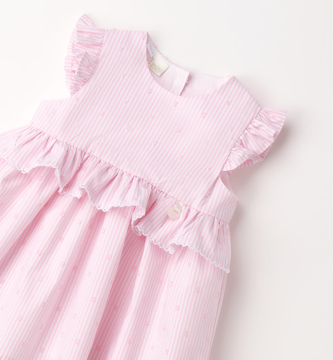 Fresh iDO dress for girls aged 1 to 24 months made from stretch cotton poplin, with a striped pattern embellished with small embroidery. Ruffled waistband. Above-the-knee length. Cotton lining. Back opening with buttons. By choosing our cotton products, you support our investment in the Better Cotton mission. This product is supplied through a mass balance system and may not contain Better Cotton. Read more at bettercotton.org/massbalance