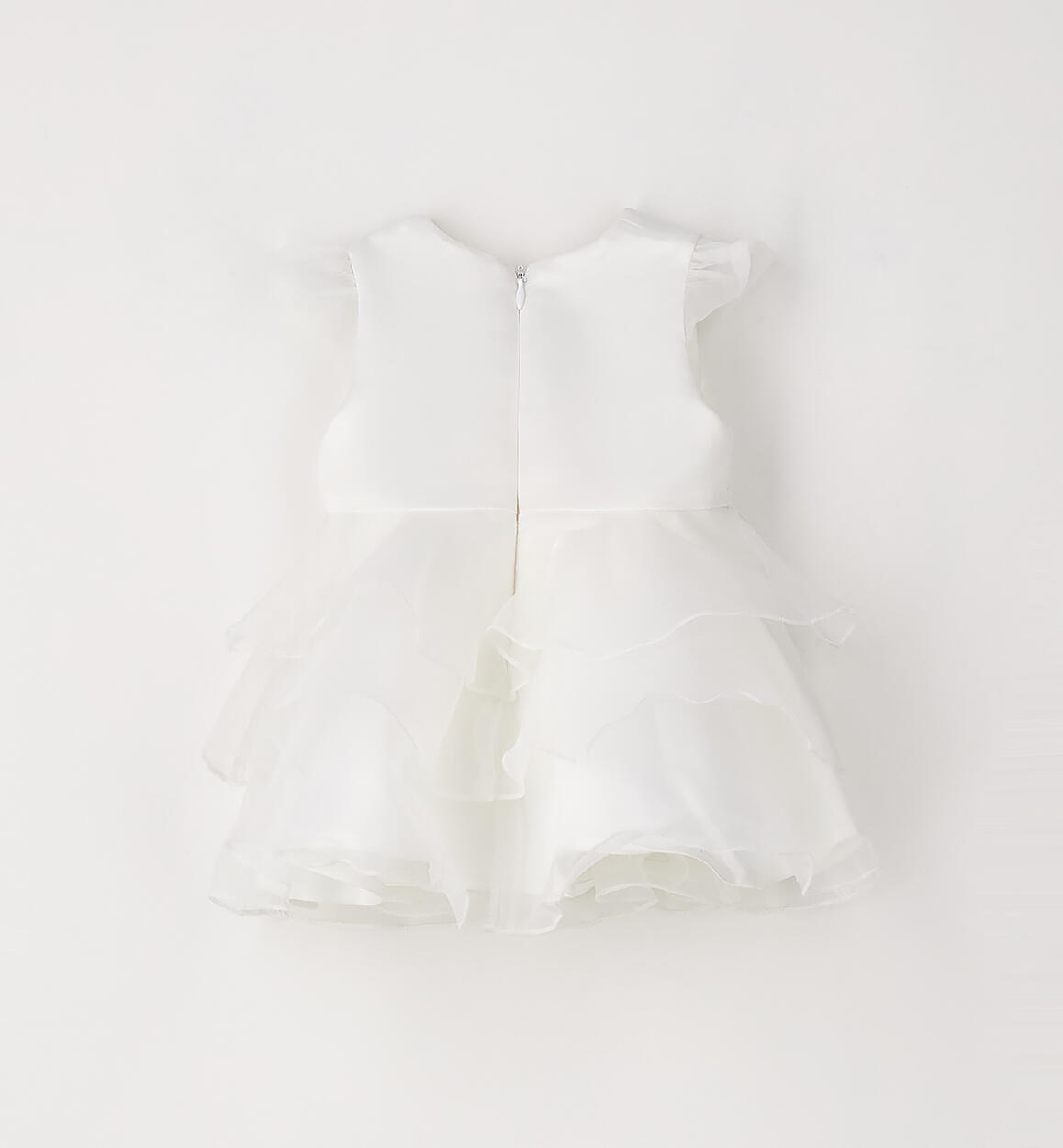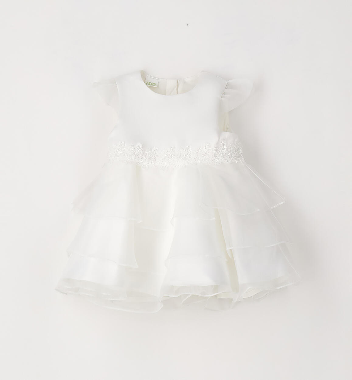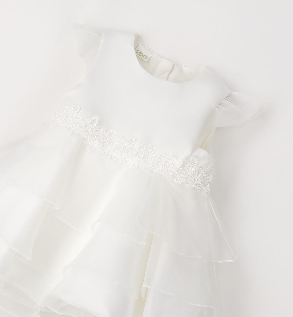Elegante abito iDO per bimba da 1 a 24 mesi realizzato in satin e gonna in organza. Modello da cerimonia con apertura dietro tramite zip invisibile. Fodera in cotone. Dettaglio in trina. Sottogonna in tulle. Lunghezza al ginocchio