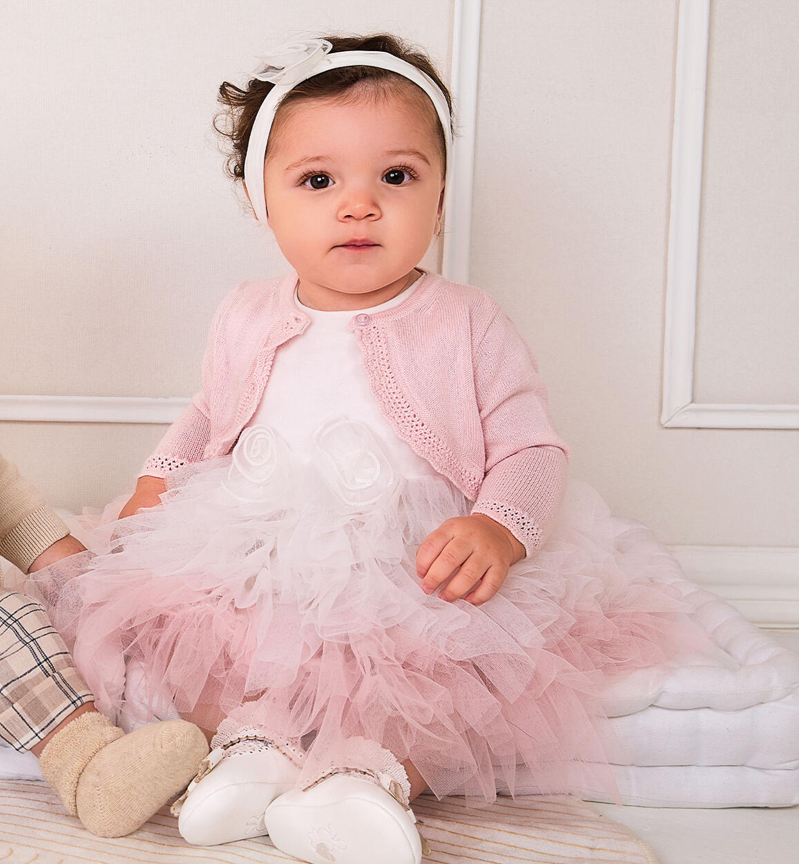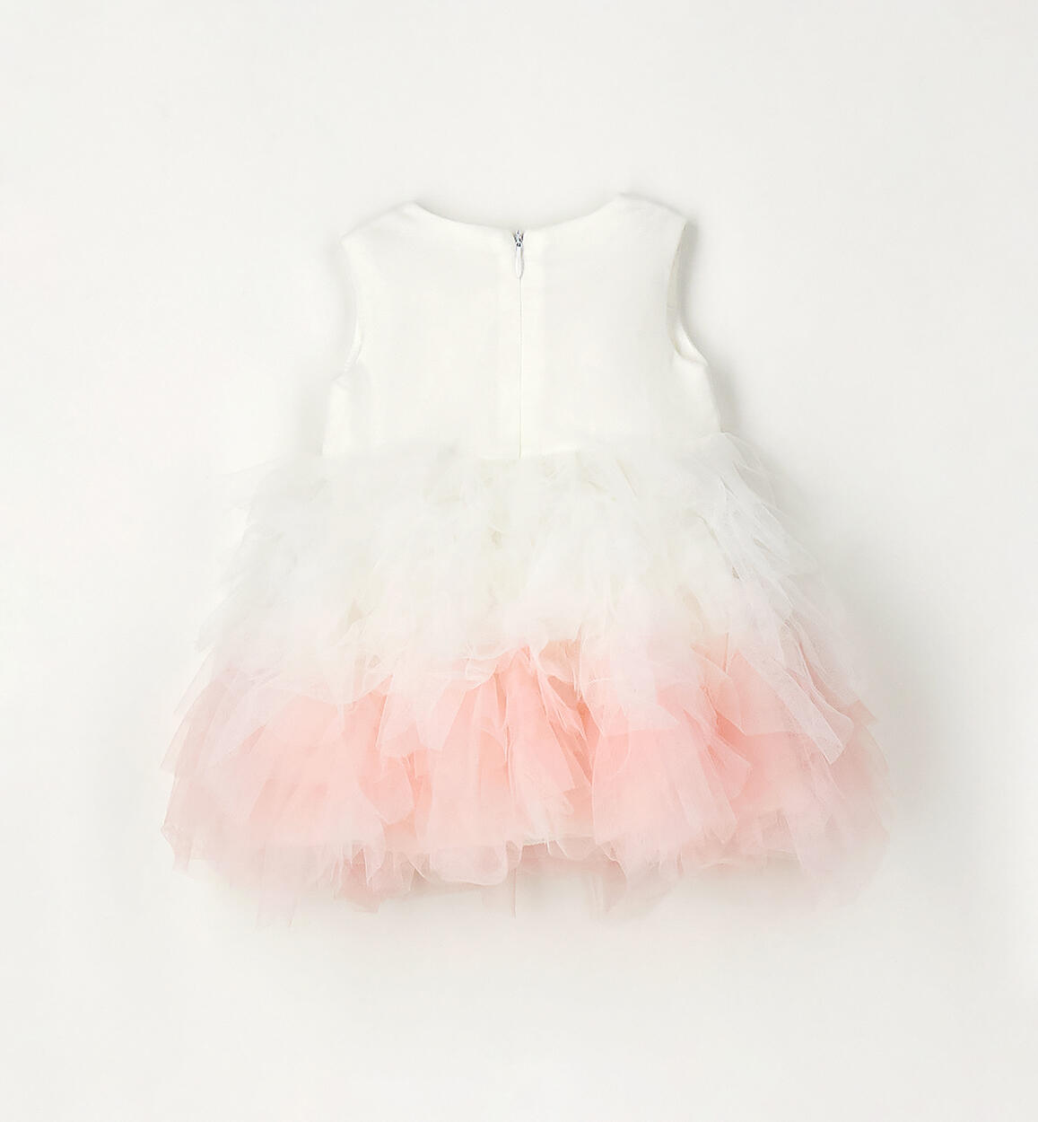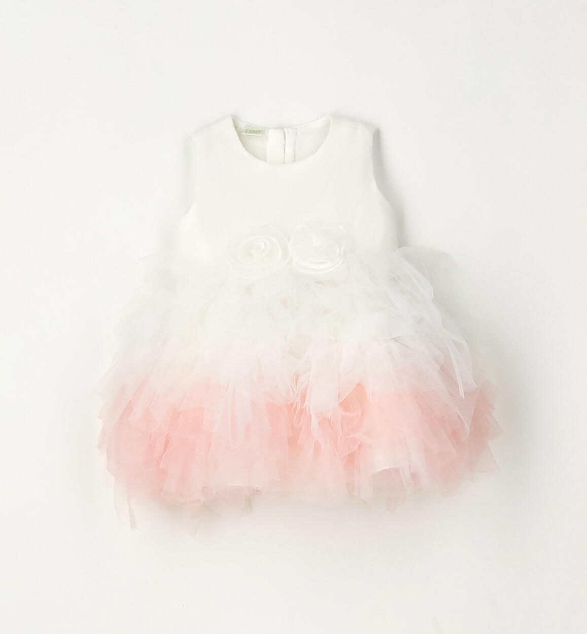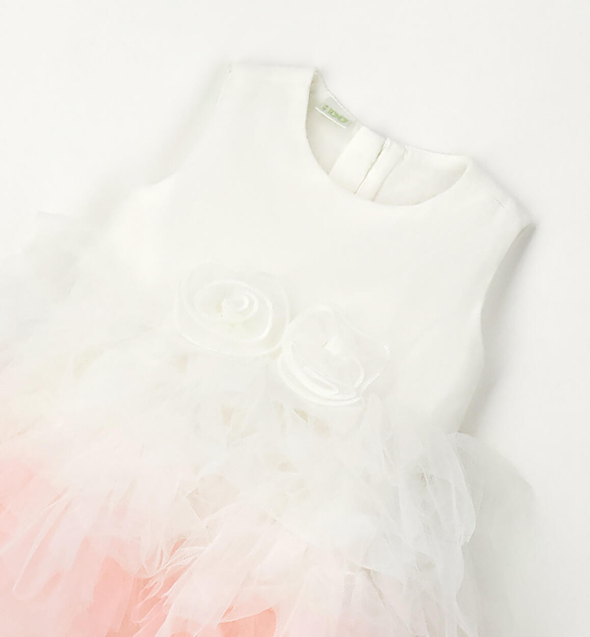 Elegante abito iDO per bimba da 1 a 24 mesi realizzato in tulle con fodera in cotone. Lunghezza al ginocchio. Apertura sul retro con zip invisibile. Fiori in vita