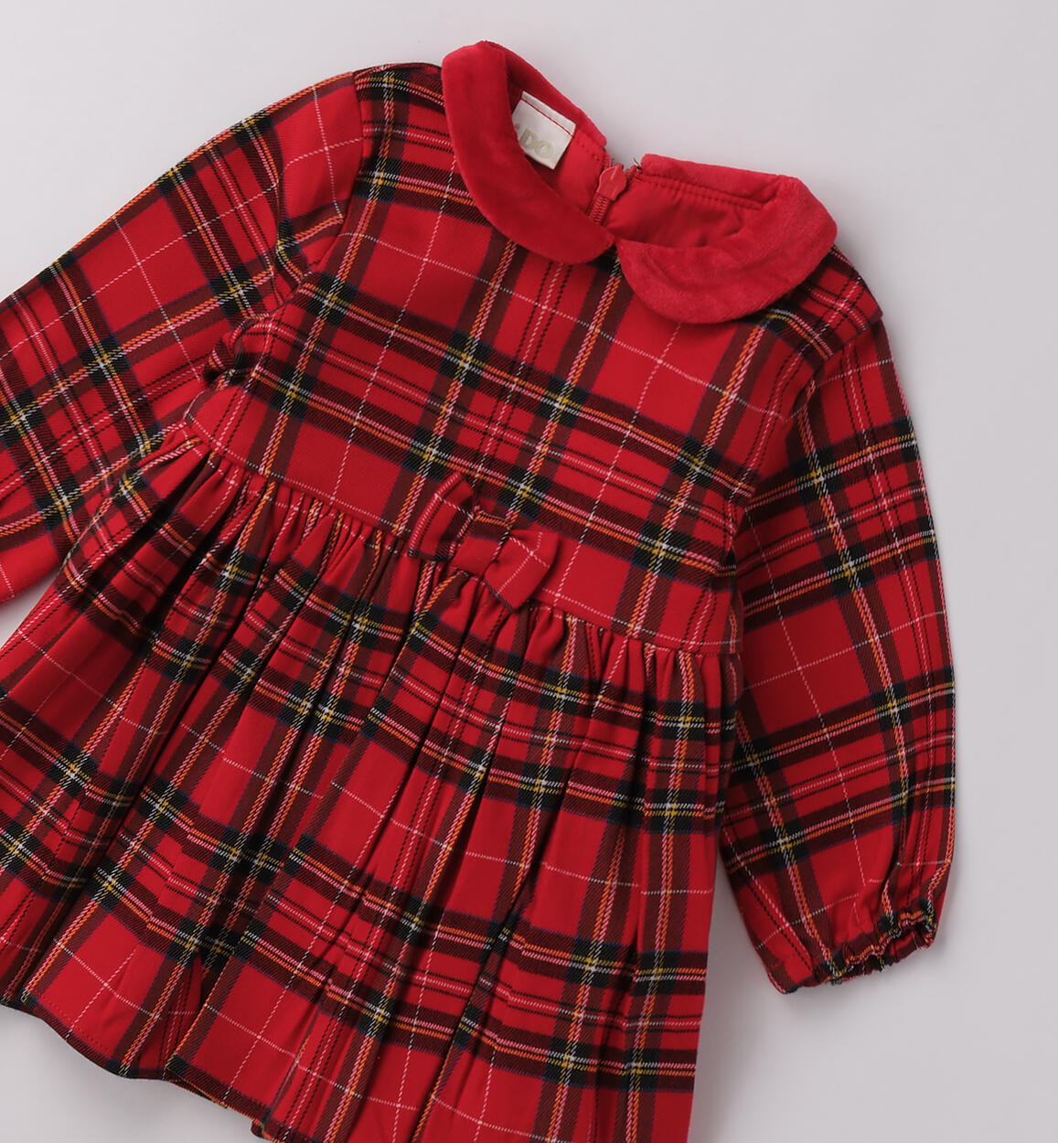 Abito per bambina iDO 1-24 mesi realizzato in twill, fantasia check. Il modello presenta apertura sul retro con zip invisibile e fodera in cotone. Lunghezza sopra al ginocchio. Perfetto per essere indossato durante le feste natalizie