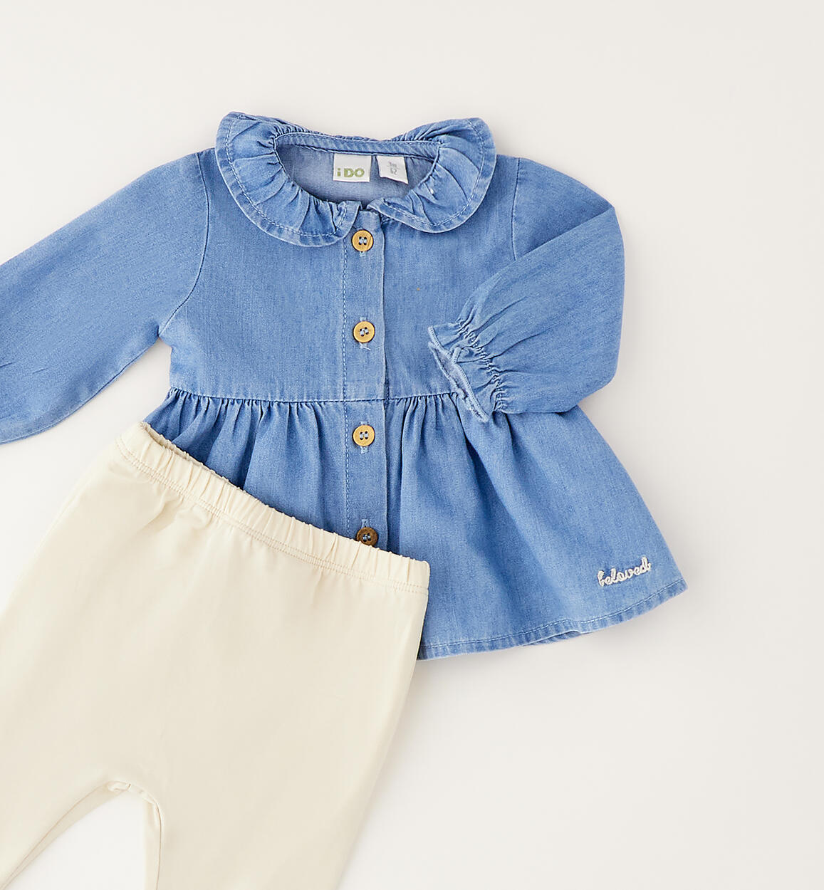 Grazioso completo iDO per bimba da 1 a 24 mesi composto da camicia e pantalone. La camicia ha il fondo manica arricciato ed è realizzata in cotone e lyocell. Apertura davanti con bottoni. Pantalone in jersey stretch di cotone con risvolto sul fondo