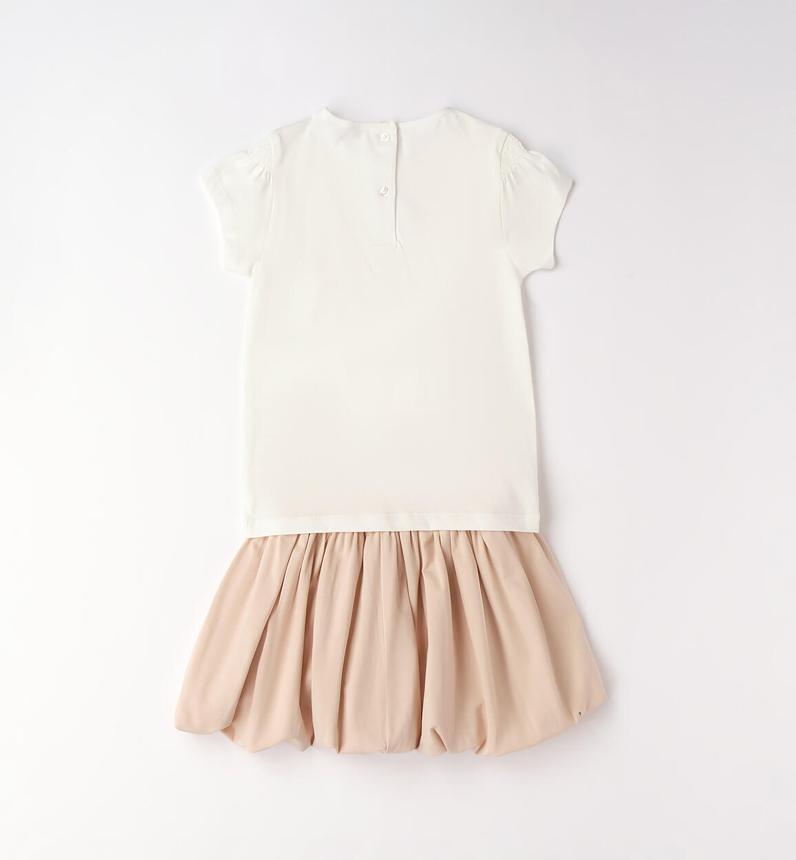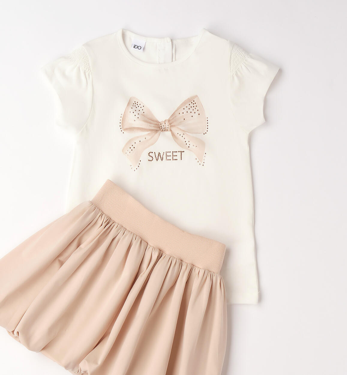 Completo elegante per bambina iDO. T-shirt in jersey 100% cotone con stampa fiocco e strass. Gonna a palloncino realizzata in jersey stretch di cotone con elastico in vita. Lunghezza sopra al ginocchio. Scegliendo i nostri prodotti in cotone, sostieni l'impegno di iDO nella missione Better Cotton. La fornitura di questo prodotto avviene tramite un sistema di bilancio di massa e potrebbe non contenere Better Cotton. Leggi di più su bettercotton.org/massbalance