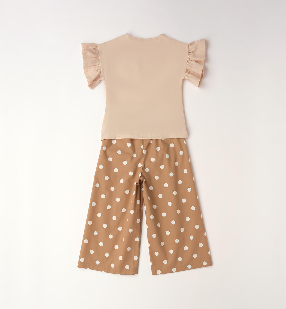Grazioso completo per bambina iDO composto da t-shirt e pantalone. La maglietta è realizzata in jersey stretch con stampa, strass e ricamo cuore. Pantalone a pois in tessuto canvas con gambia ampia ed elastico in vita con coulisse. Scegliendo i nostri prodotti in cotone, sostieni l'impegno di iDO nella missione Better Cotton. La fornitura di questo prodotto avviene tramite un sistema di bilancio di massa e potrebbe non contenere Better Cotton. Leggi di più su bettercotton.org/massbalance