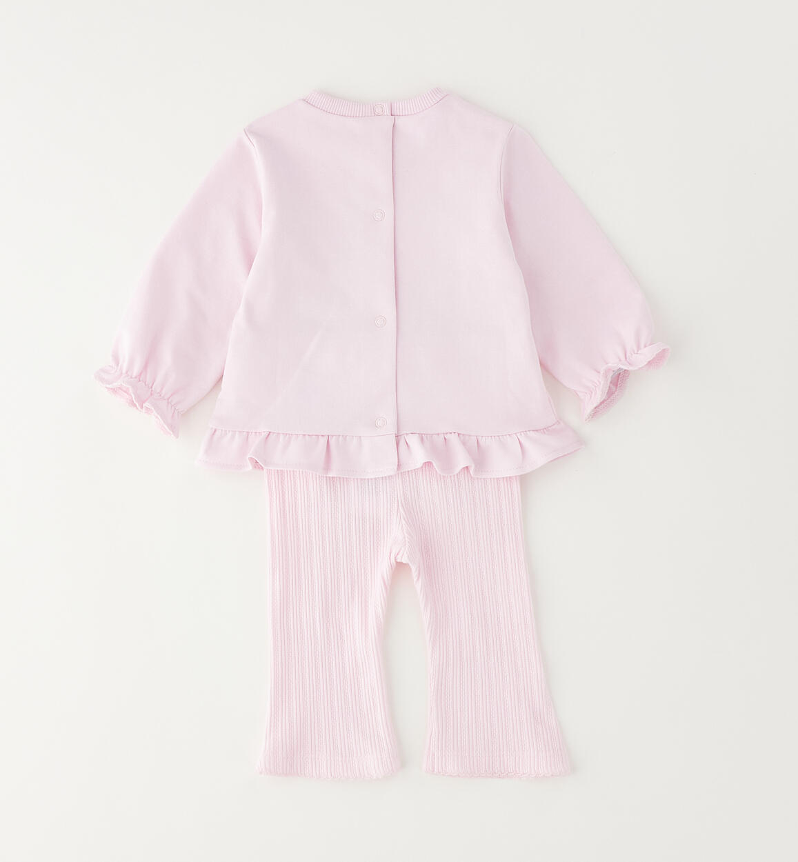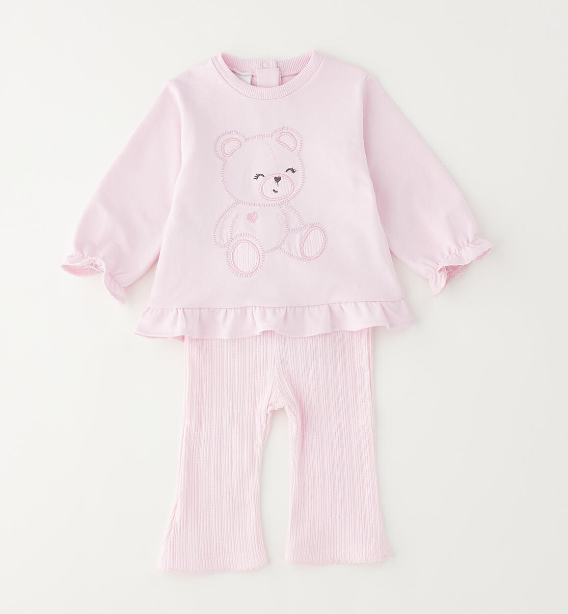 Completo per bimba iDO da 1 a 24 mesi realizzato in cotone stretch. La maglia è in felpa con apertura sul retro con bottoni a pressione e dolce ricamo davanti. Fondo manica con elastico e arricciatura. Leggings in costina rigata con fondo a zampa. Scegliendo i nostri prodotti in cotone, sostieni il nostro investimento nella missione Better Cotton. La fornitura di questo prodotto avviene tramite un sistema di bilancio di massa e potrebbe non contenere Better Cotton. Leggi di più su bettercotton.org/massbalance